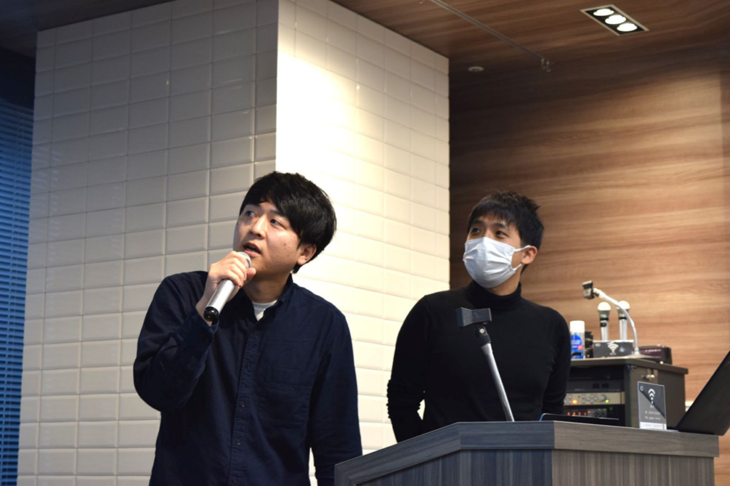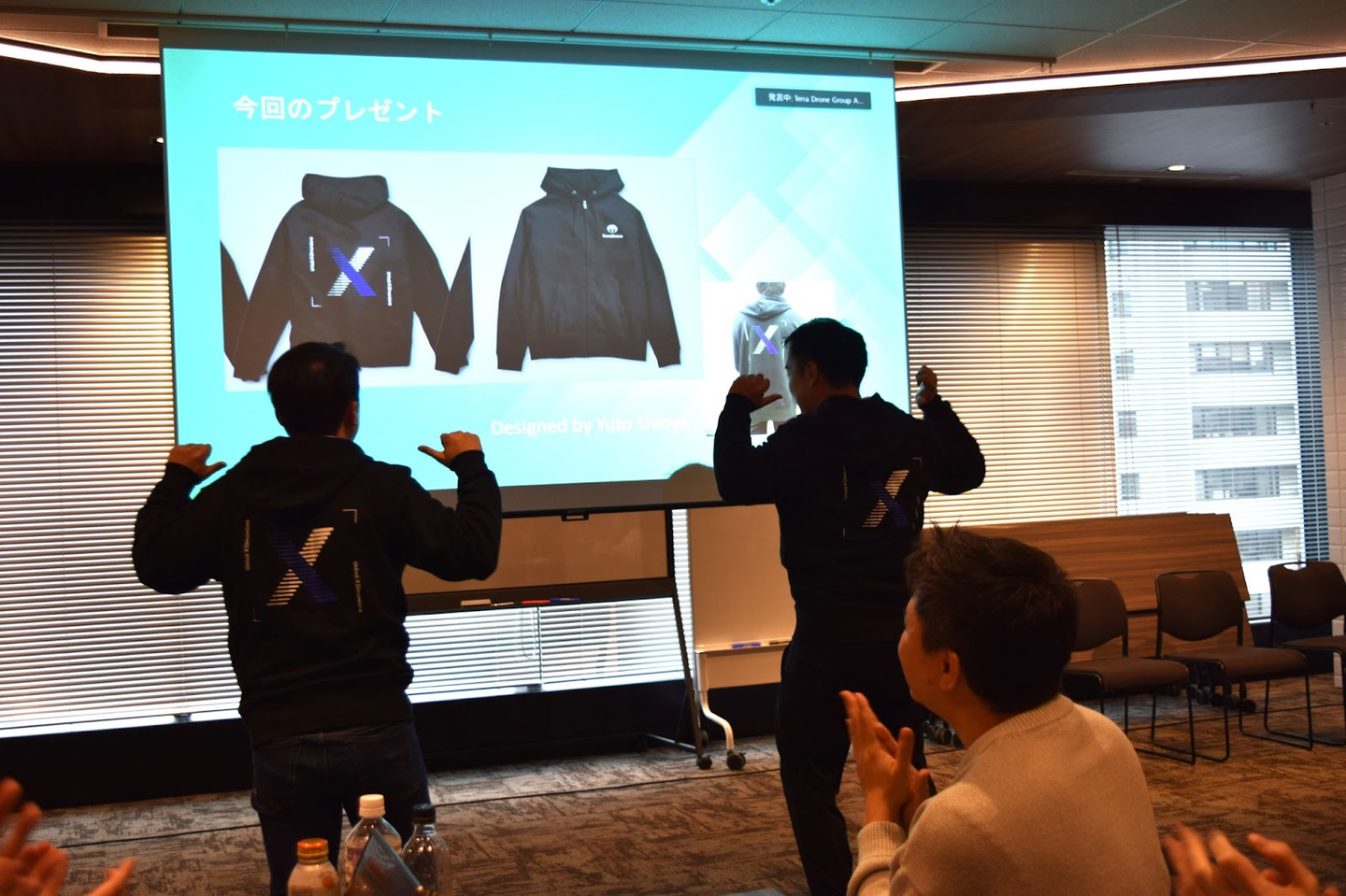 経営陣、部長陣から上期の振り返りと今期の目標についてプレゼンを実施する前に、全社員にサプライズとしてX(クロス)パーカーを配布いたしました。取締役の関さんと神取さんにパーカーを羽織っていただき、サプライズ登場!