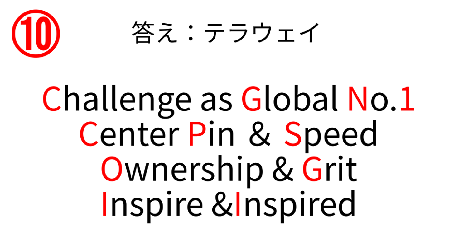 テラドローンのValueである「Terra Way」の4つの頭文字でした。流石に難しいですね笑