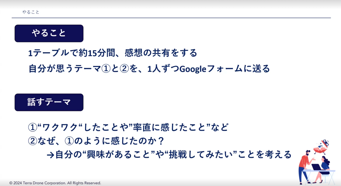 まずは、会社の中長期目標を会話を通して理解を深めることを目的として「Terra Vision 2030」や今回のプレゼン、テラドローンで挑戦したいことについてを、ざっくばらんに感想をシェアする機会を設けました。