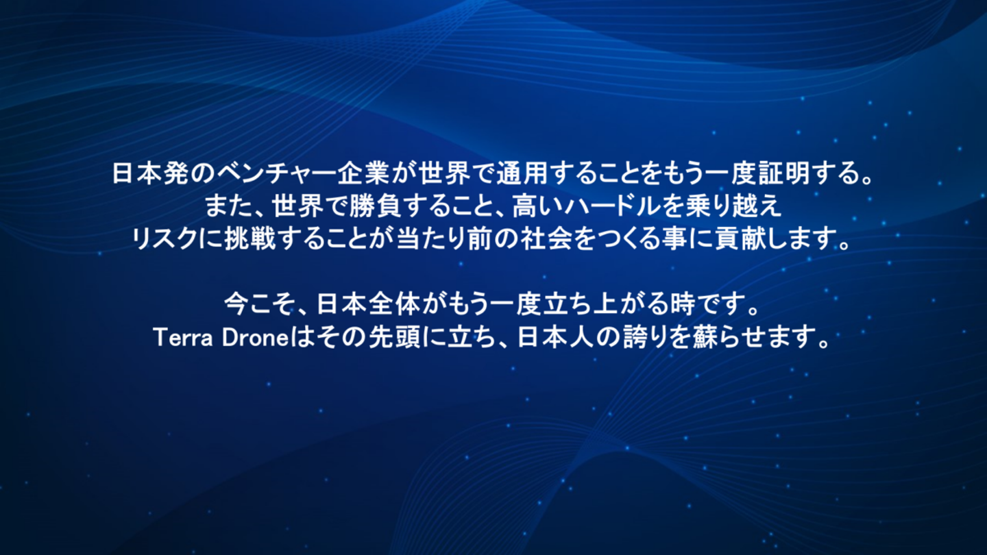 「バブル崩壊以降、日本のイノベーションが停滞している現状を打破する必要性を強く感じています。私は、30代から海外で挑戦した経験から、日本企業ではチャレンジが少なく、イノベーションが生まれにくいと痛感していました。だからこそ、日本発の世界で勝てる企業が必要ということでテラドローンを創設しました。」