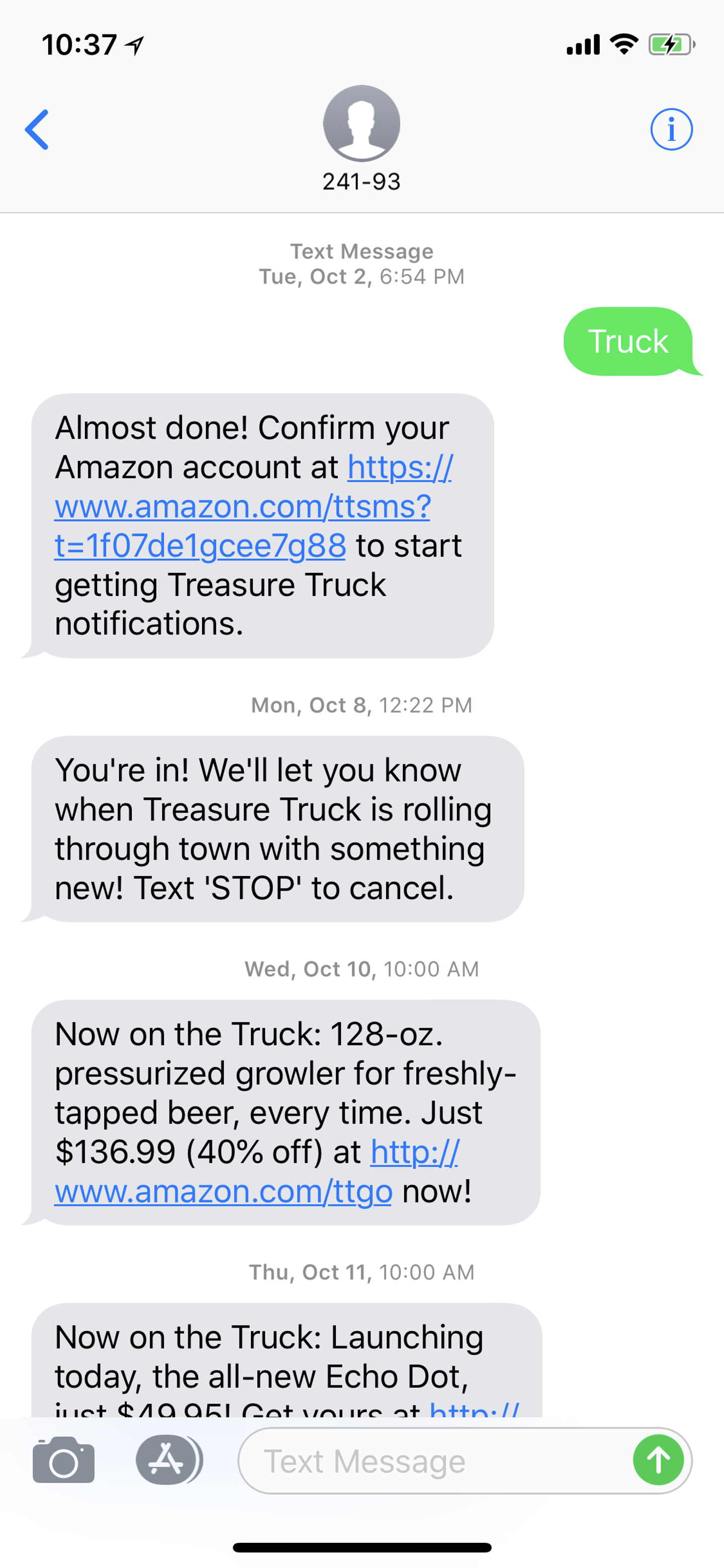 最初に「24193」宛に「Truck」とメッセージを送るだけで、amazonから必要情報が送られてきます。