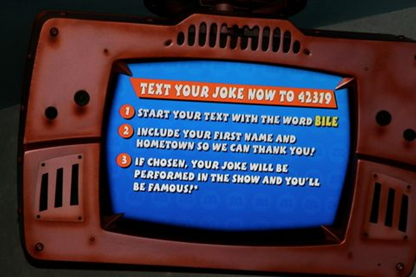 アトラクションの待ち時間中に、天井から吊らされているテレビに写し出される5つの番号(42319※毎回番号は変わります)に、指定のワードを含むダジャレを送ると、本番のショーでモンスター達にピックアップされお披露目してもらえる、というものです。