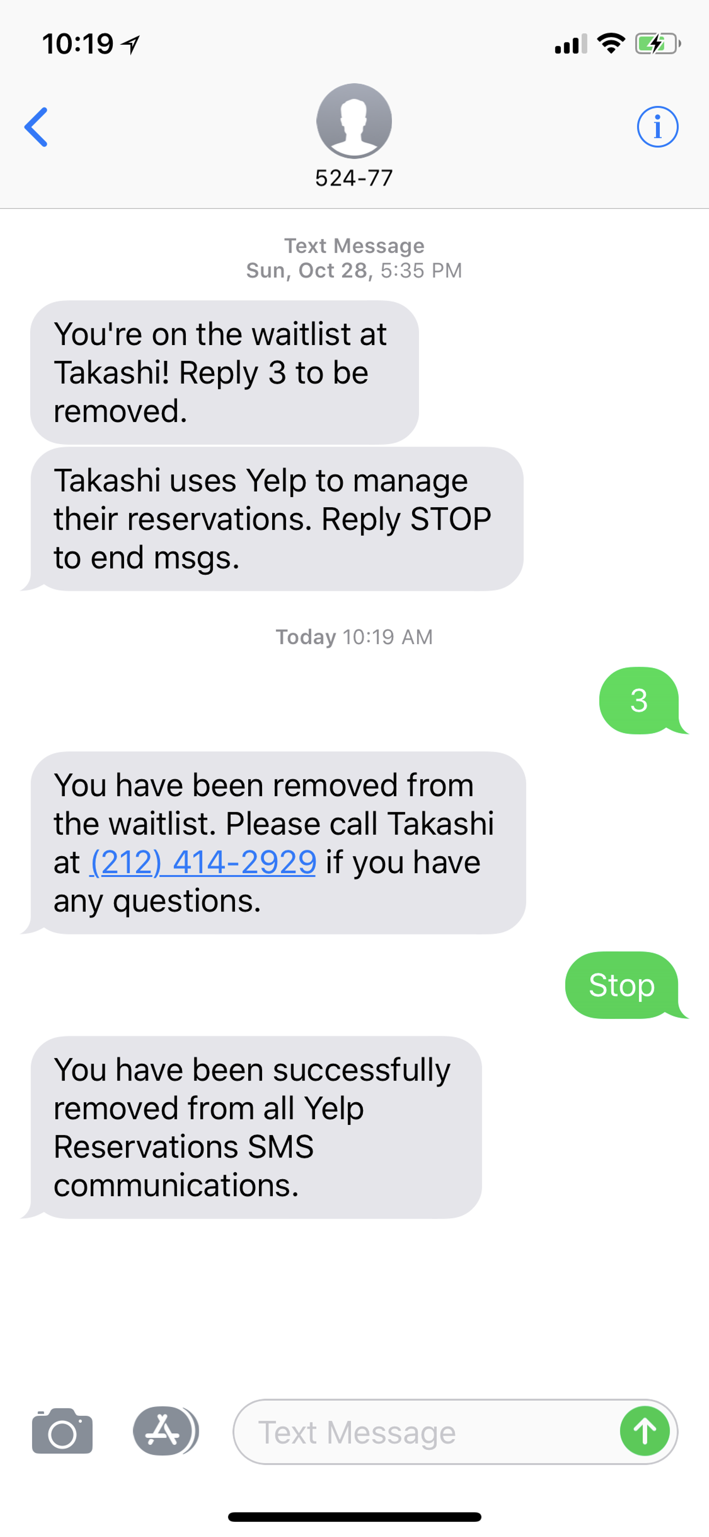 例えば、この画像では、「3」を送信すると自動で待ち順を取り消すことができ、「Stop」を送信すると、今後お店からの通知メッセージを停止することができます。