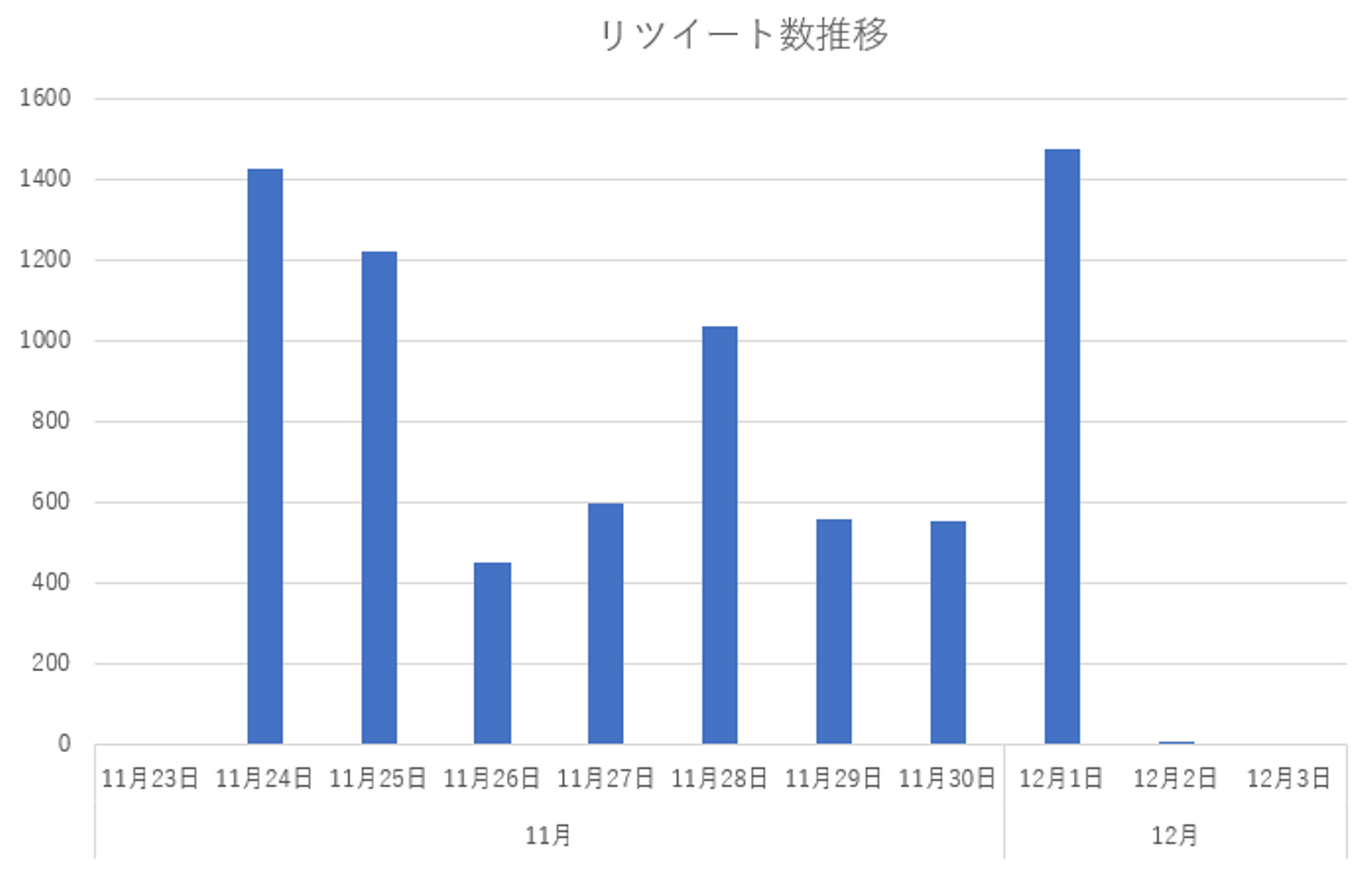 いいね数は、都倉選手の呼びかけツイートにいいね数最多となる1800件のいいねがついているため、11月24日が最多となっています。