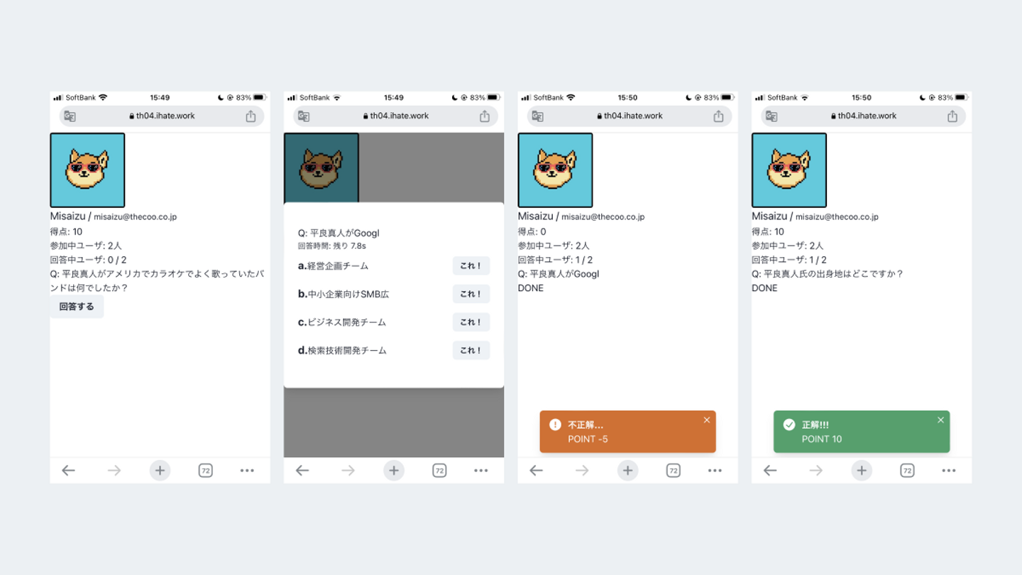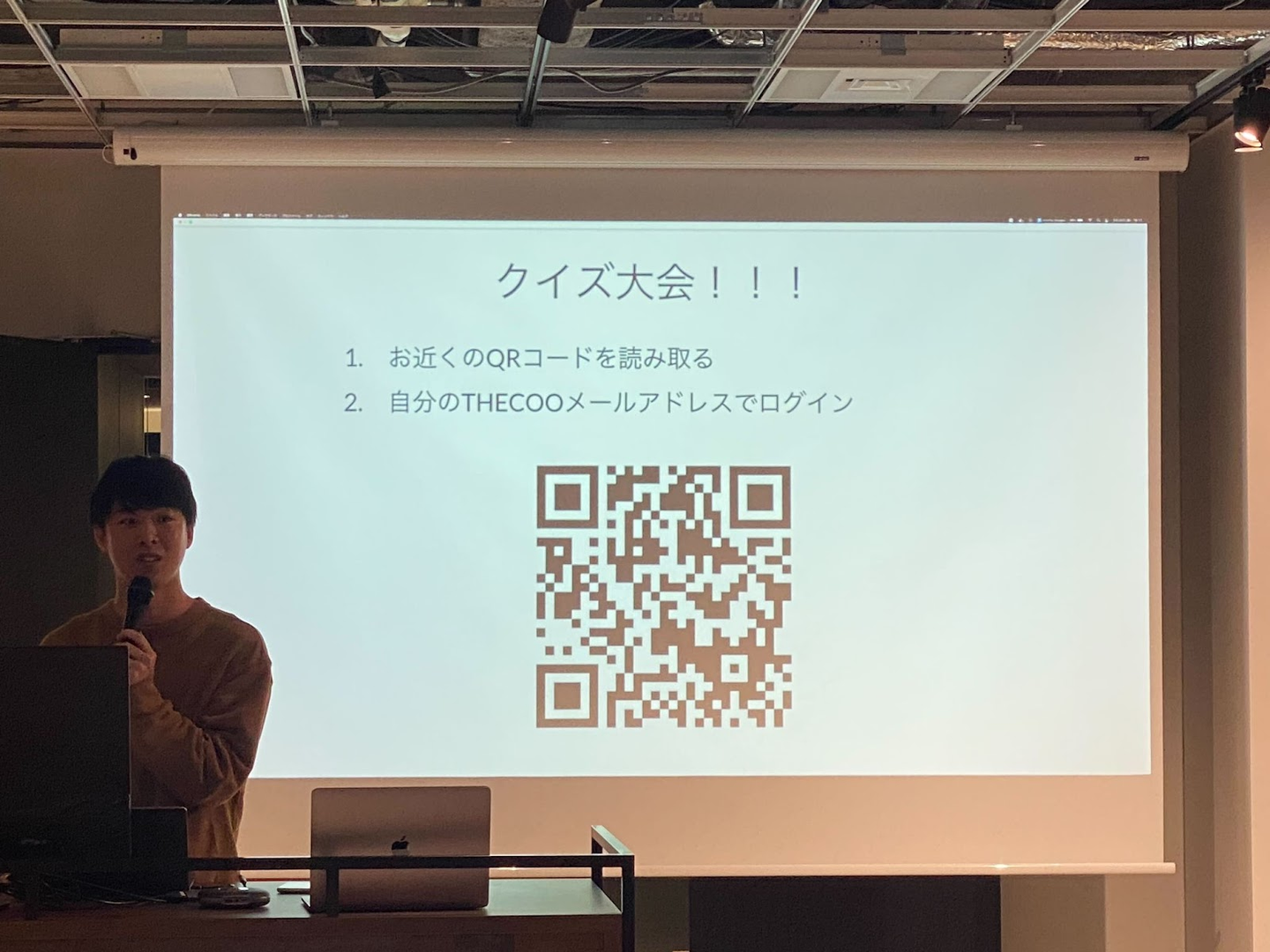 勝手に芸能人の方々の情報を利用する訳にはいかないため、今回はデモとして弊社代表・平良の情報を用意。プレゼン開始と同時にフリースペースの各テーブルへQRコードが配られ、リンクにアクセスをするとクイズ解答フォームが開きます。