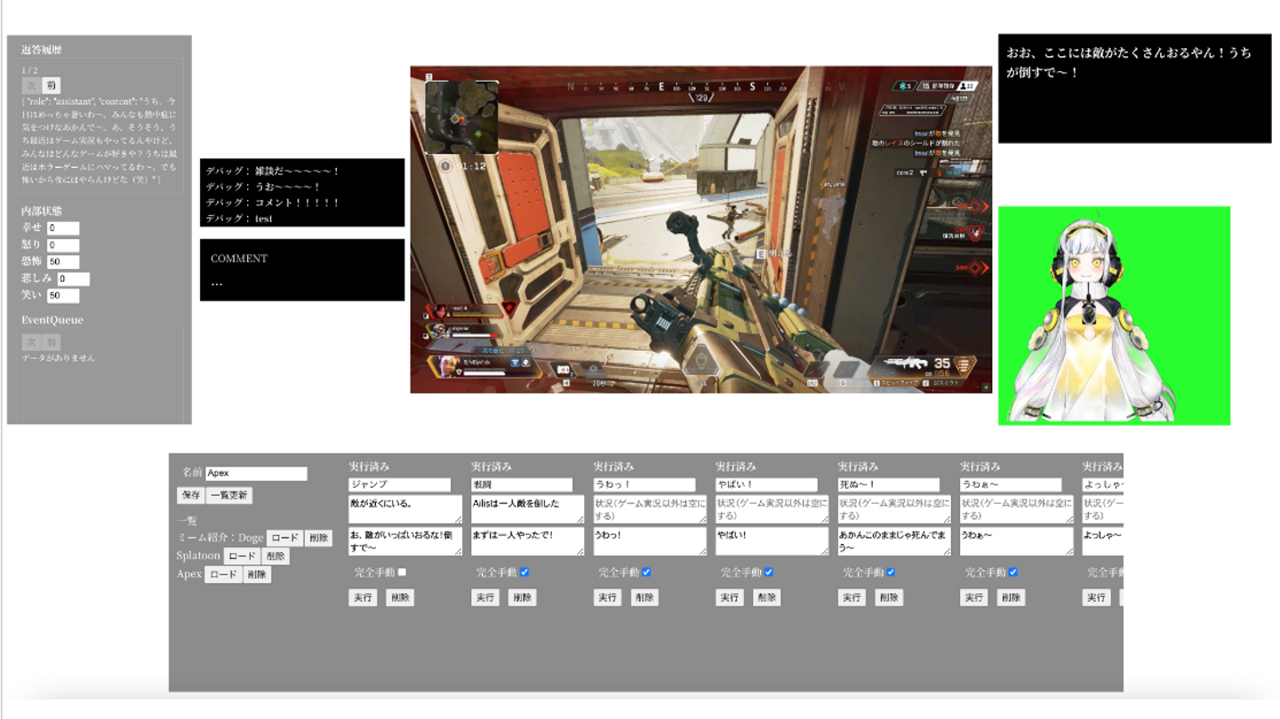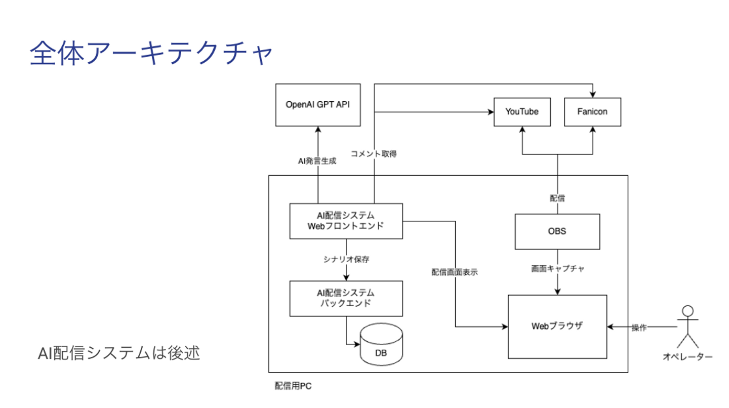 さすがエンジニアタッグというべきか、ChatGPTだけでなく音声認識、配信への接続、2Dモーションモデルの挙動、そのほかさまざまな技術を繋ぎ込み、非常に凝ったアーキテクチャのプロダクトを作り上げてきていました。めちゃくちゃ楽しんで作ったのであろうことが伝わってきます。(本当に四日間しか使わなかったんだろうか?)