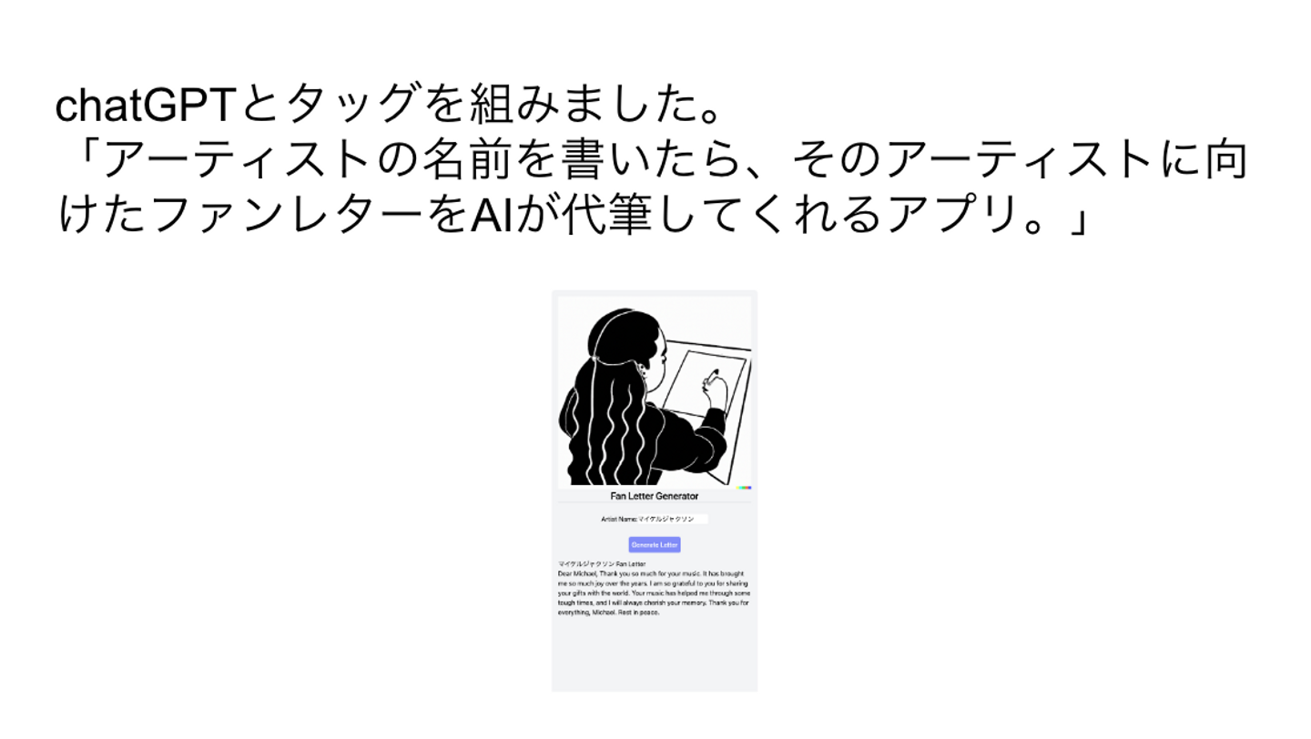 彼のプロダクトは、「アーティストの名前を入力したら、AIがファンレターを代筆してくれるアプリ」。作りとしてはシンプルで、事前にChatGPTに与えた情報を元に、整った文章をAIが提供してくれるというものです。