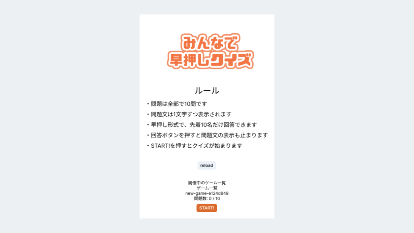 平良の好きな言葉、好きな食べ物など、正直どうでもいいクイズをリアルタイムで生成し、解答の正答率を競うという、視聴者参加型のデモンストレーションを行うようです。アクセス過多への対策として、同時に10名しかアクセスできないなど、妙に可用性に気を配られた設計がされています。ここはさすがテックリードの開発といったところでしょうか。普段の苦労が垣間見えます。