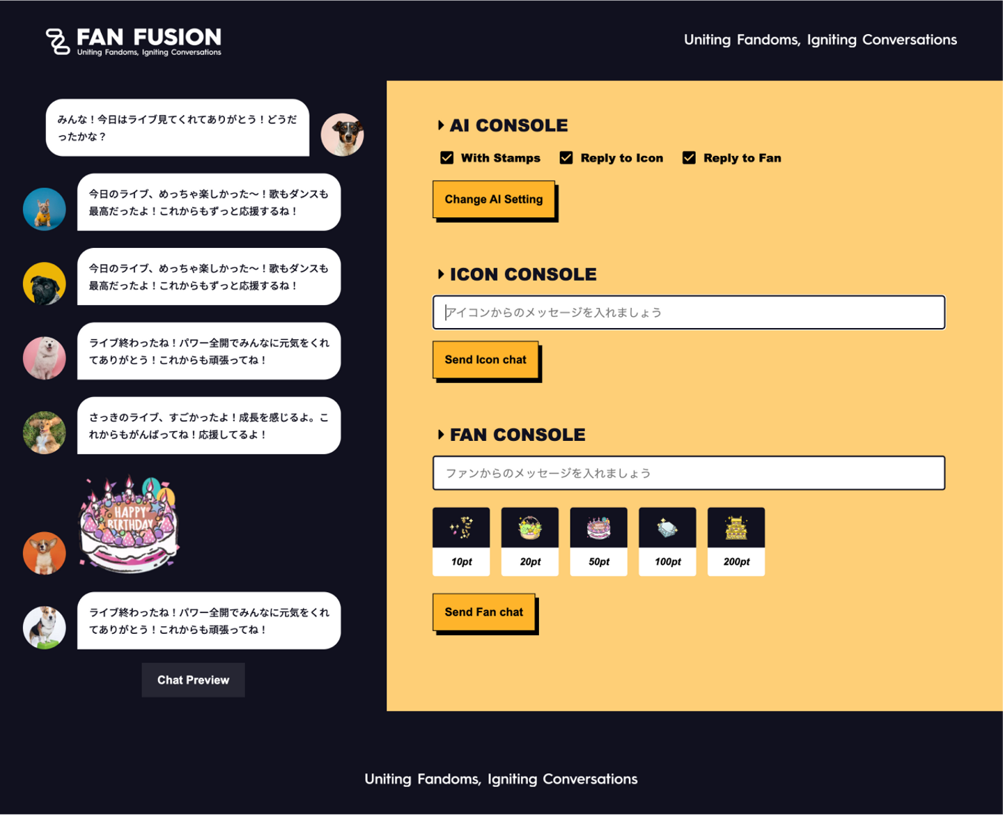 - ChatGPT APIの使用用途:アイコンやファンの発言に対してChatGPTが動的に相槌をうち、コミュニケーションを円滑化する