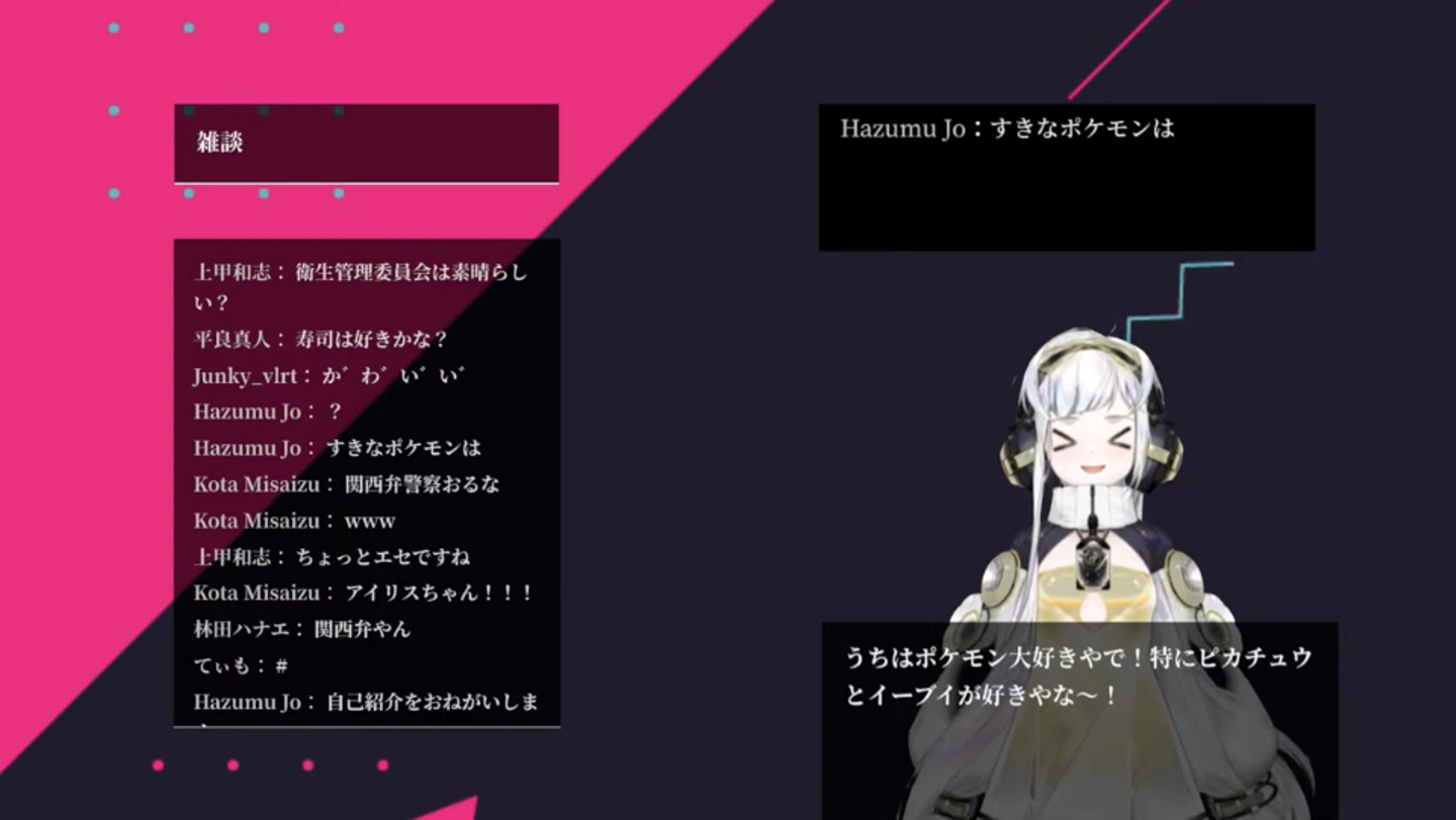 デモンストレーションは実際のYoutube配信を用いて行われ、視聴者(社員)が配信にコメントするとAIが関西弁の可愛らしい口調で解答してくれます。AItuberのモデルにはフリーの2Dモーションモデル「アイリス」が使用されており、本物のYoutuberさながらのクオリティに、会場の至る所から「すごい!」の声が上がります。