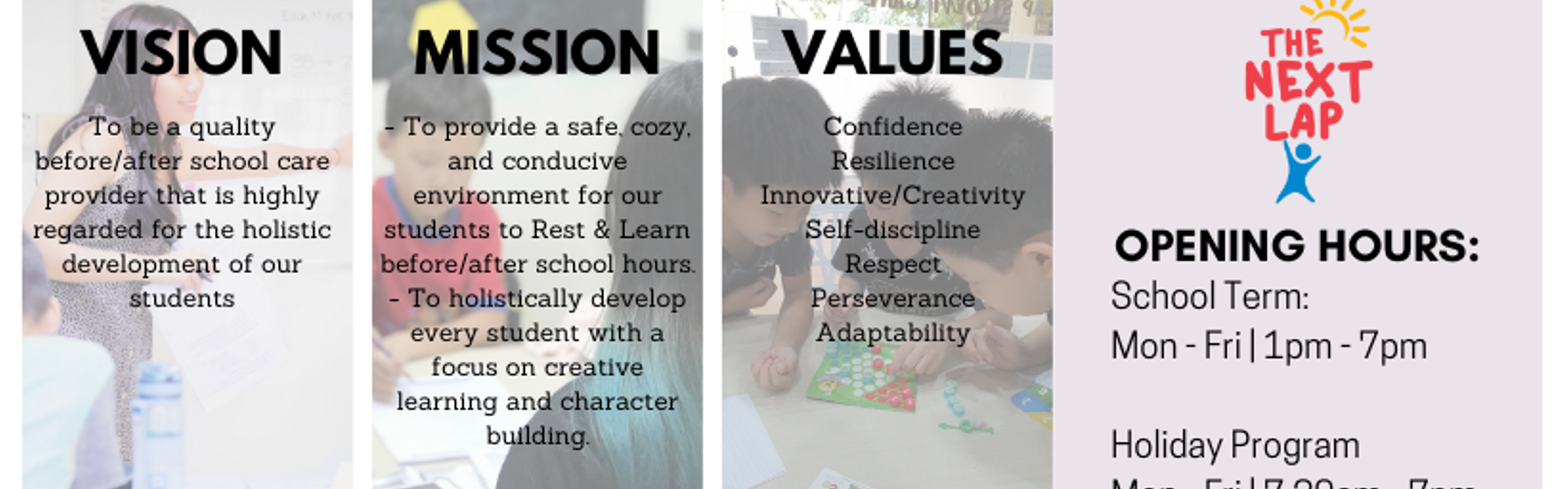 To provide a safe, cozy, and conducive environment for our students to Rest & Learn before/after school hours. To holistically develop every student with a focus on creative learning and character building.