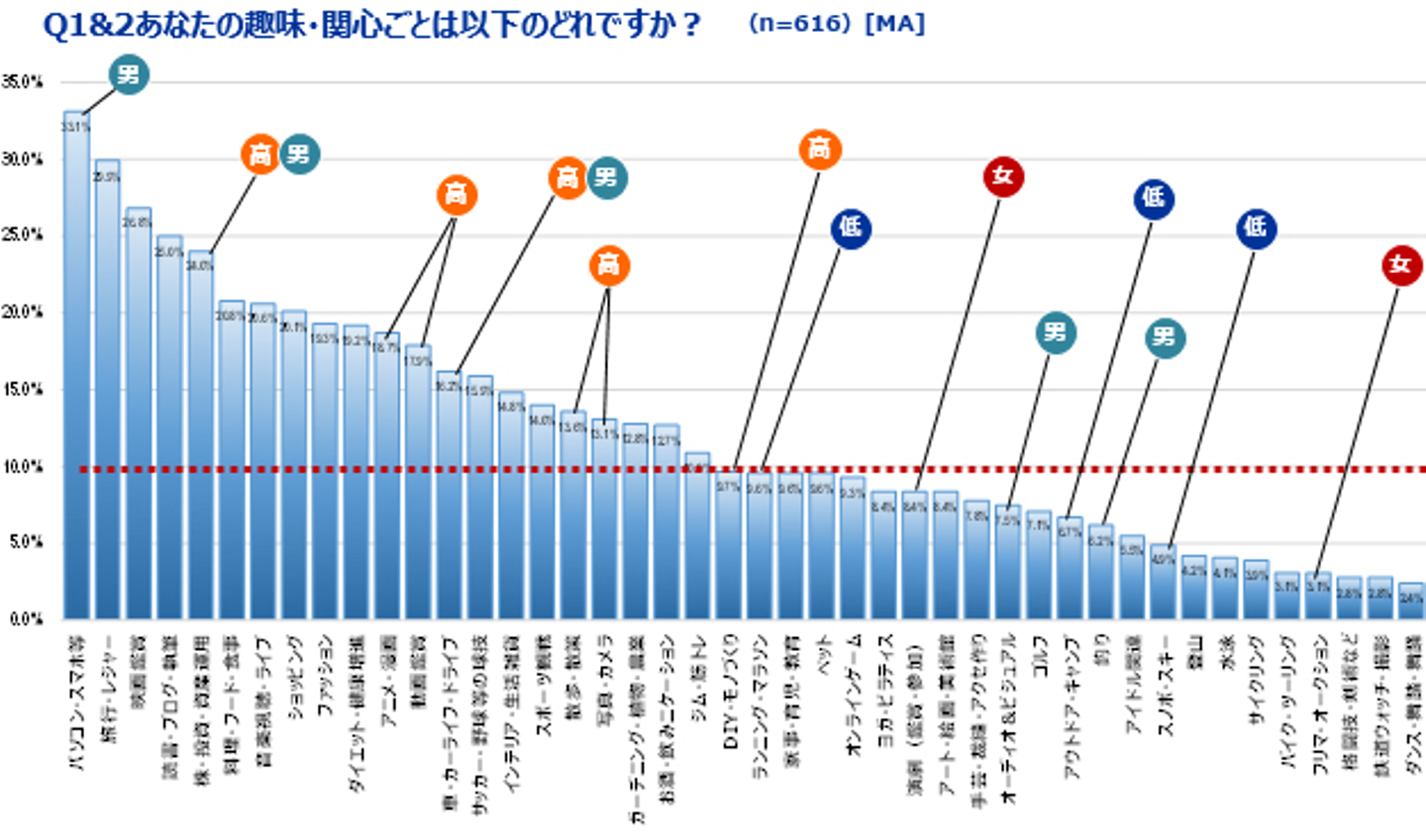 下図は趣味関心ごとのランキングである。詳細はレポートに記載されているが、これらは全被験者の合算であり、それぞれの趣味によってそれを牽引しているターゲットは異なっている。それにしても、10年前では趣味になりえなかった項目がそれなりのウエイトを占めているのは、時代の変化を感じさせる。
