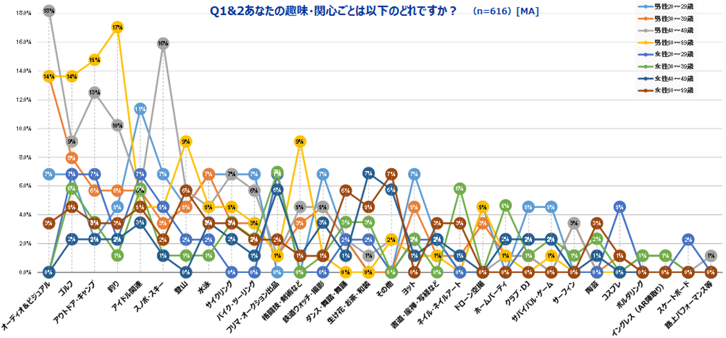 この手の調査では、非常におおざっくりした趣味や余暇時間の使い方の統計、例えばレジャー白書などや、特定のテーマを深く掘ったもの、例えばインターネットのSNSの調査などは頻繁に行われます。しかし、マクロな視点で、かつピンポイントの新しい趣味・関心対象を調査したデータは中々見当たりません。その辺が今回の大きな狙いです。