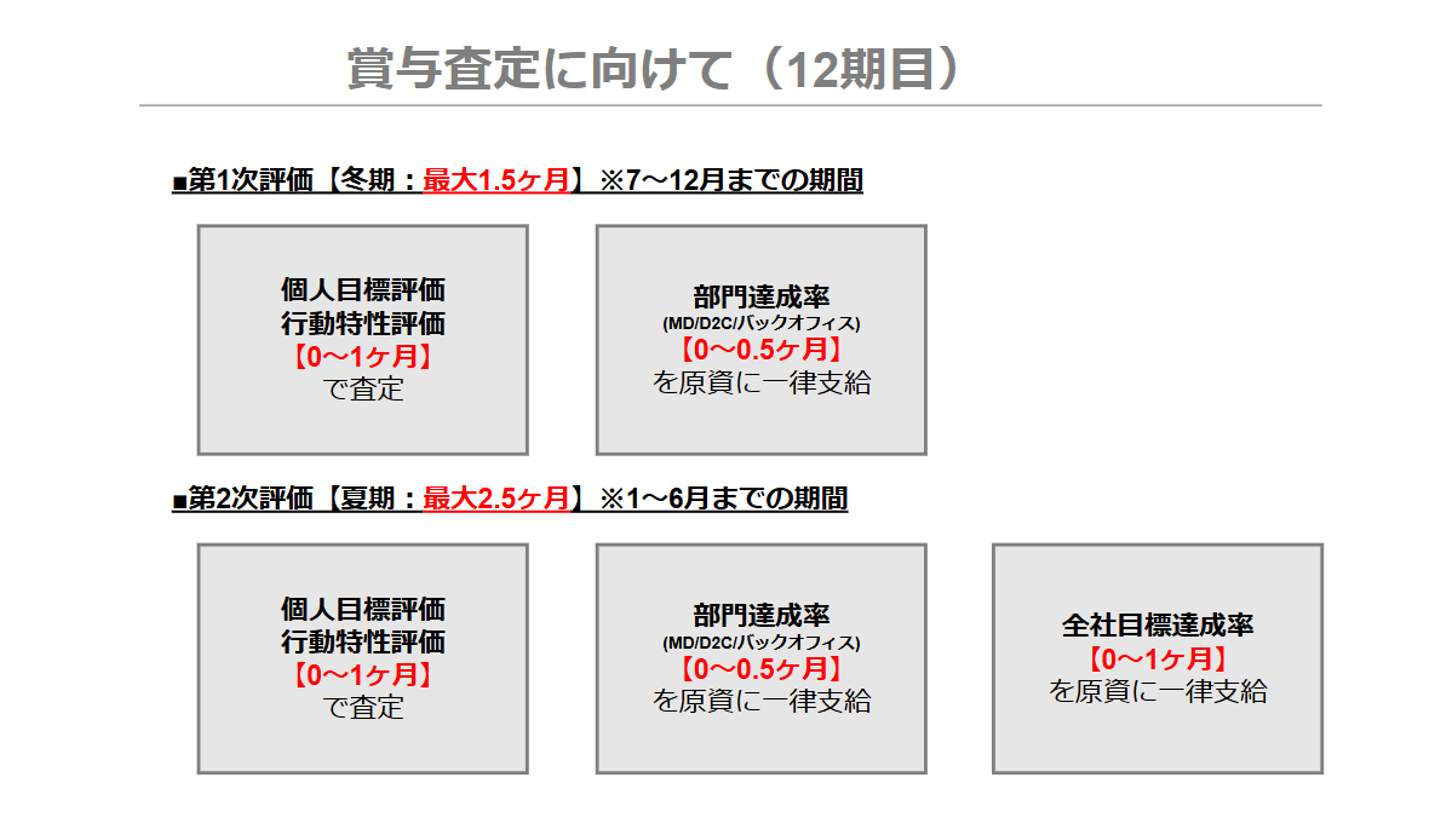 以下の表のように、冬期賞与が月収の最大1.5ヶ月分、夏期賞与が月収の最大2.5ヶ月分あり、年間賞与額は月収の最大4ヶ月分を受け取れるシステムです。上記の通り、その人が半期の間に生み出したバリューをわかりやすく評価できる仕組みになっています。