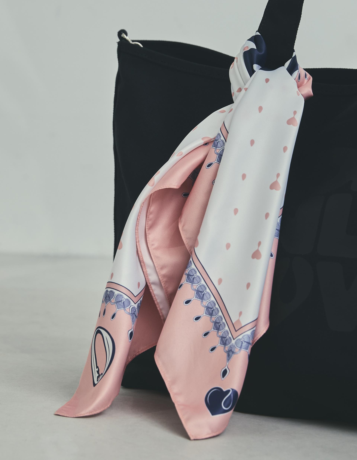 心を掴んで離さないディテールへのこだわりを詰め込んだスペシャルギフト——。2ndコレクションのアイテムを30,000円(税込、送料別)以上お買い上げの方には、特別なオリジナルスカーフをプレゼント。肌に馴染む上質な風合いで、夏の装いをエレガントに昇華させる。ハート&涙モチーフを夏らしいカラーで再構成し、首元やヘア、バッグチャームとしてマルチに活用いただけます。