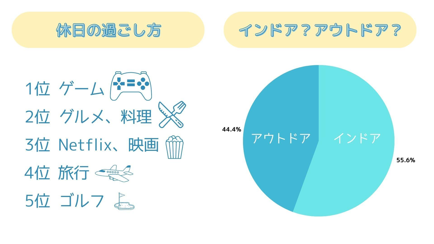 ・休日の過ごし方はゲーム、グルメと答えたメンバーが多数!ゴルフは5位ながらもコアなファンが多めで、オフィスに室内パターゴルフマットもあります笑
