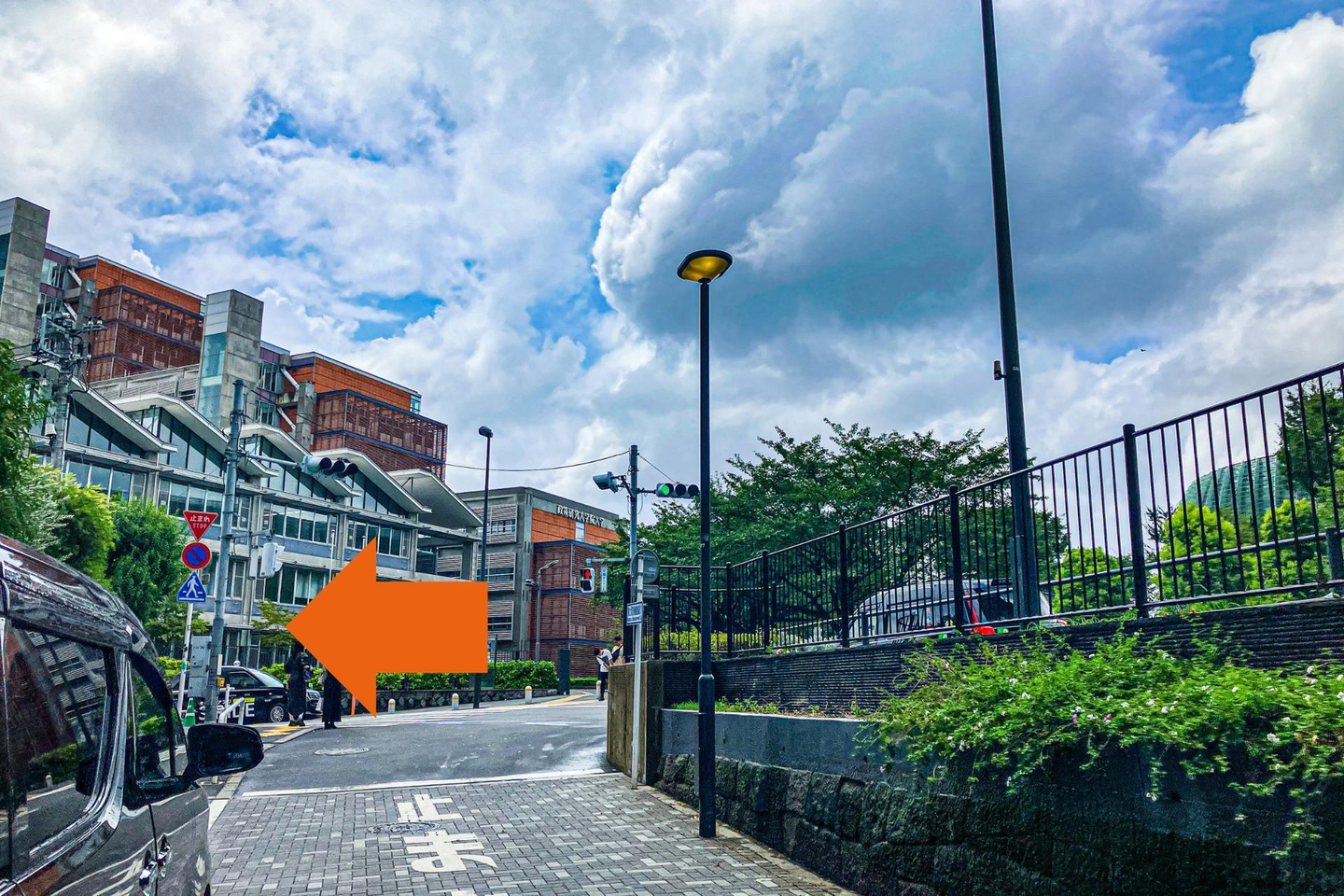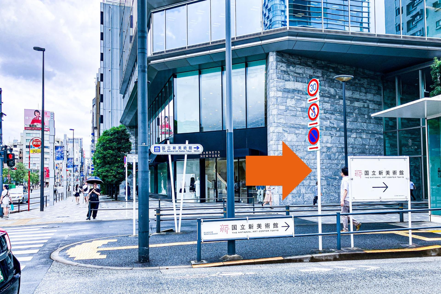 150mほど歩いて、突き当たりに政策研究大学院大学、右手に国立新美術館が見えてきたら、左側に曲がってください。