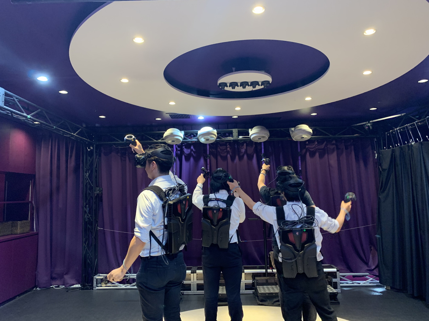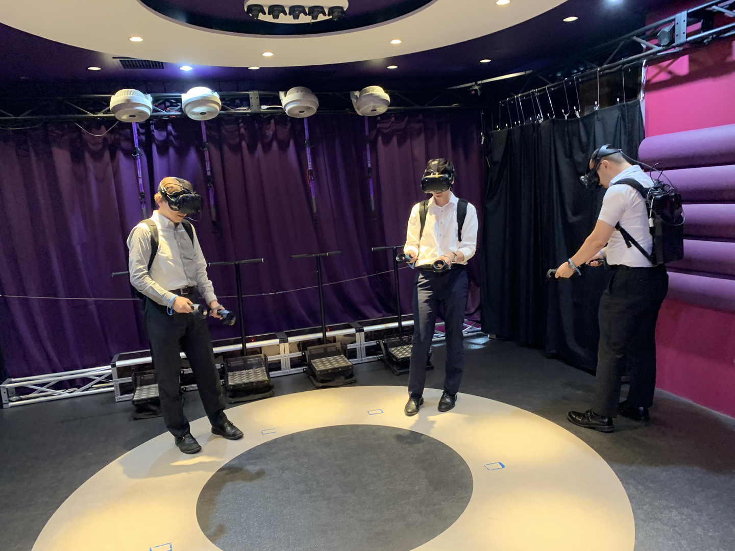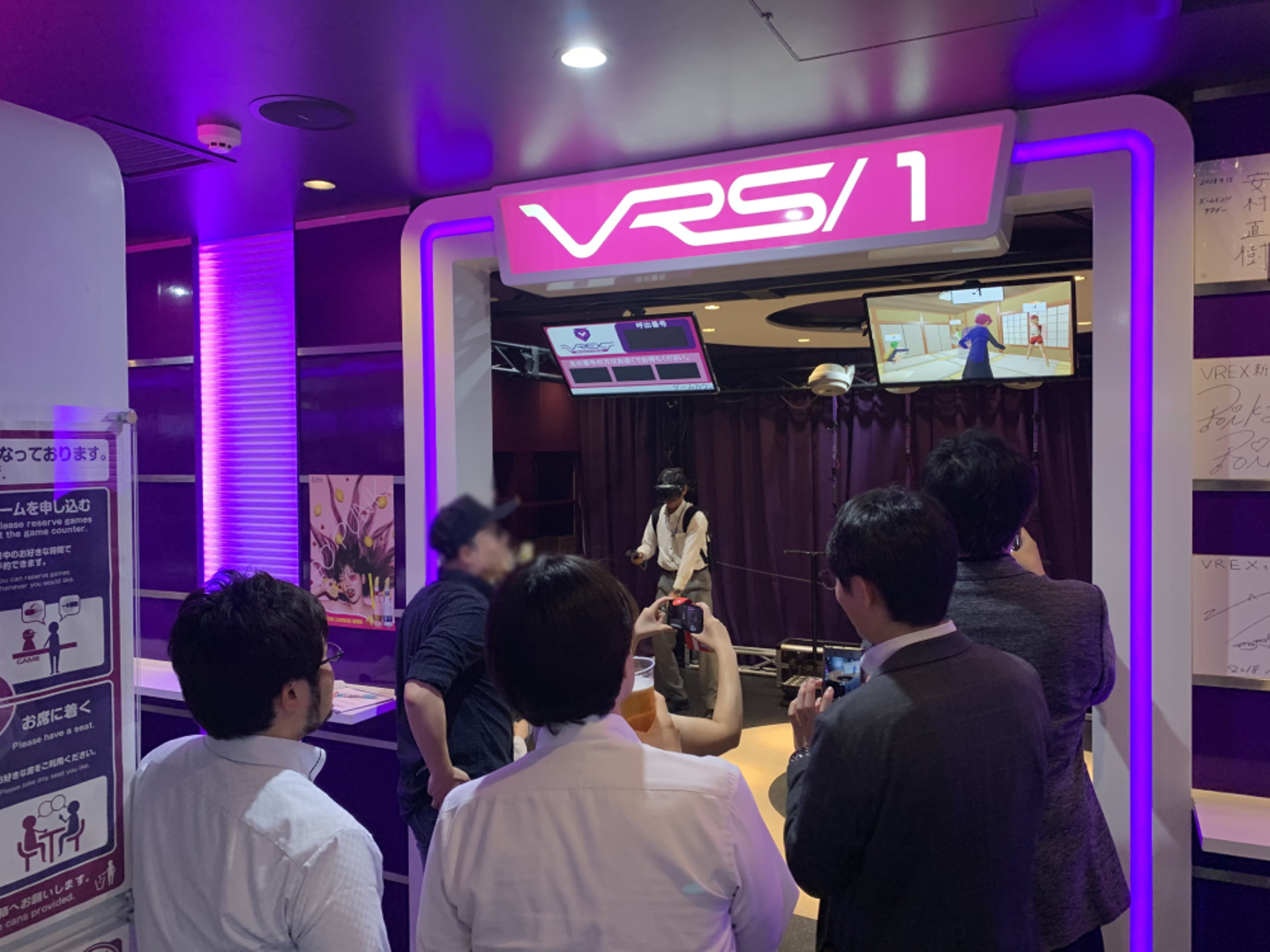 金曜日の業務終了後、業務提携している会社さんの社員さんと弊社社員、総勢34名がVREX 新宿店に集合。スーツ姿の男性がぞろぞろと、サイバーな空間を埋め尽くします。