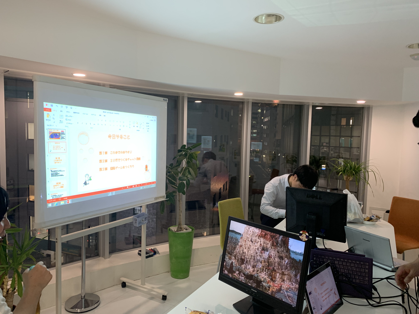 今回の勉強会は、直接自分で手を動かすわけではなく、だれでも簡単にゲームが作れるツールの紹介がメイン。企画者であるYさんの画面を皆で見ながら進めるため、プロジェクターとディスプレイ×2をつなぎ、細かい作業もよく見える状態に。