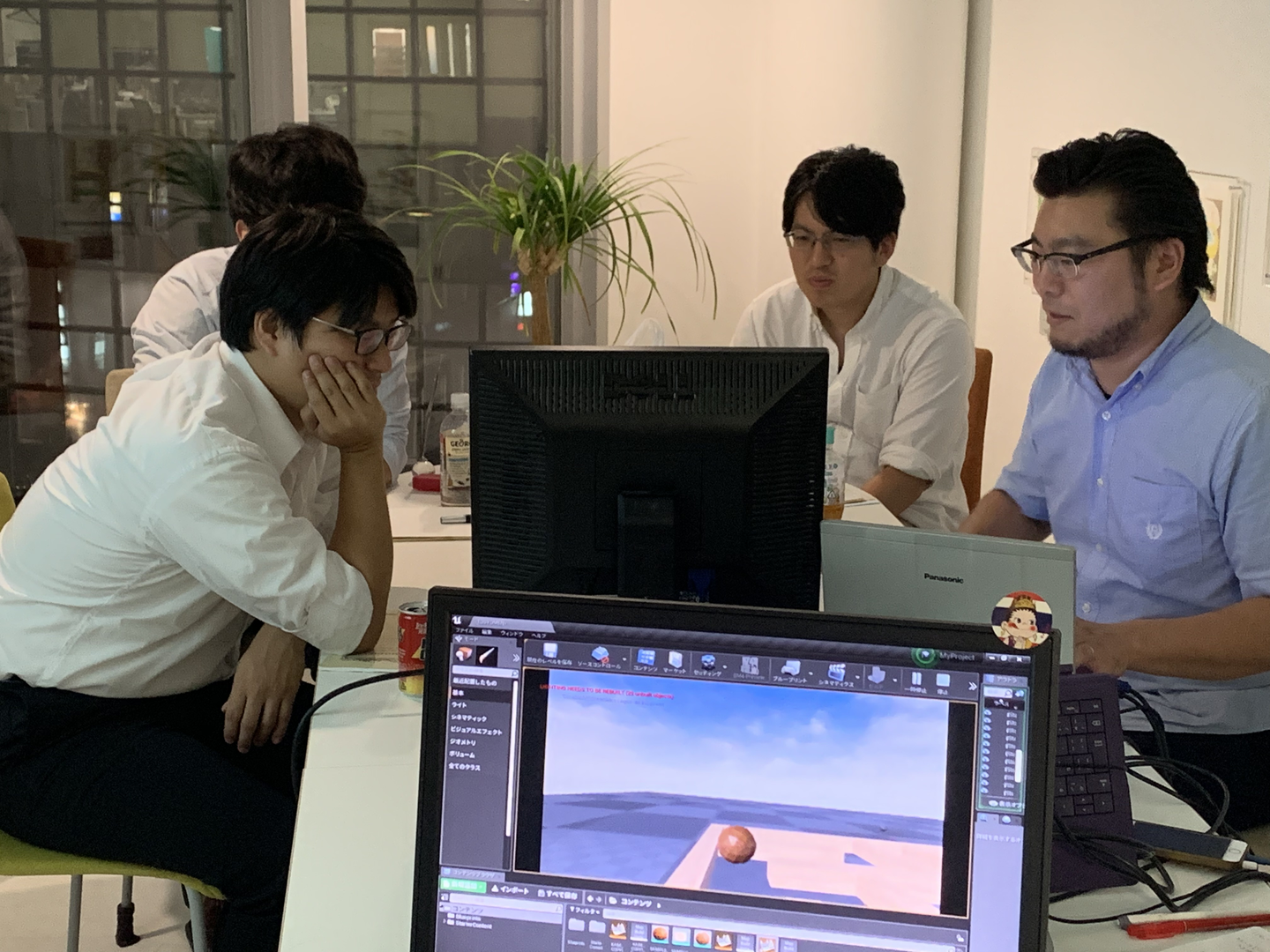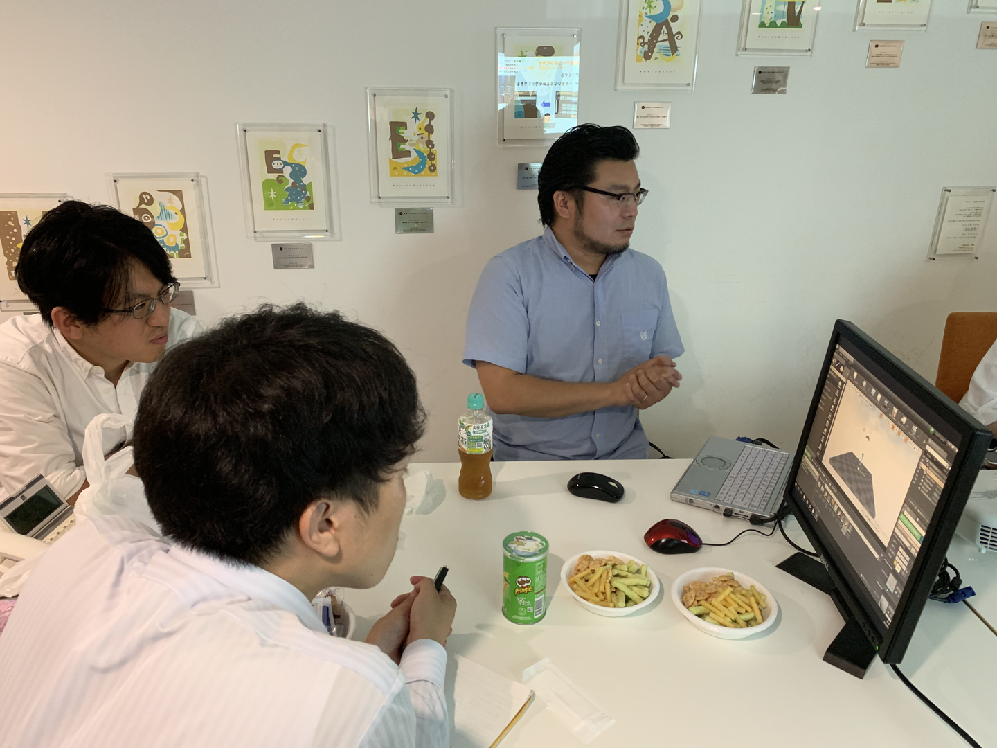 企画してくれた技術推進室所属のYさん(青シャツの方)の指示のもと、わらわらとディスプレイの設置からみんなで行います。