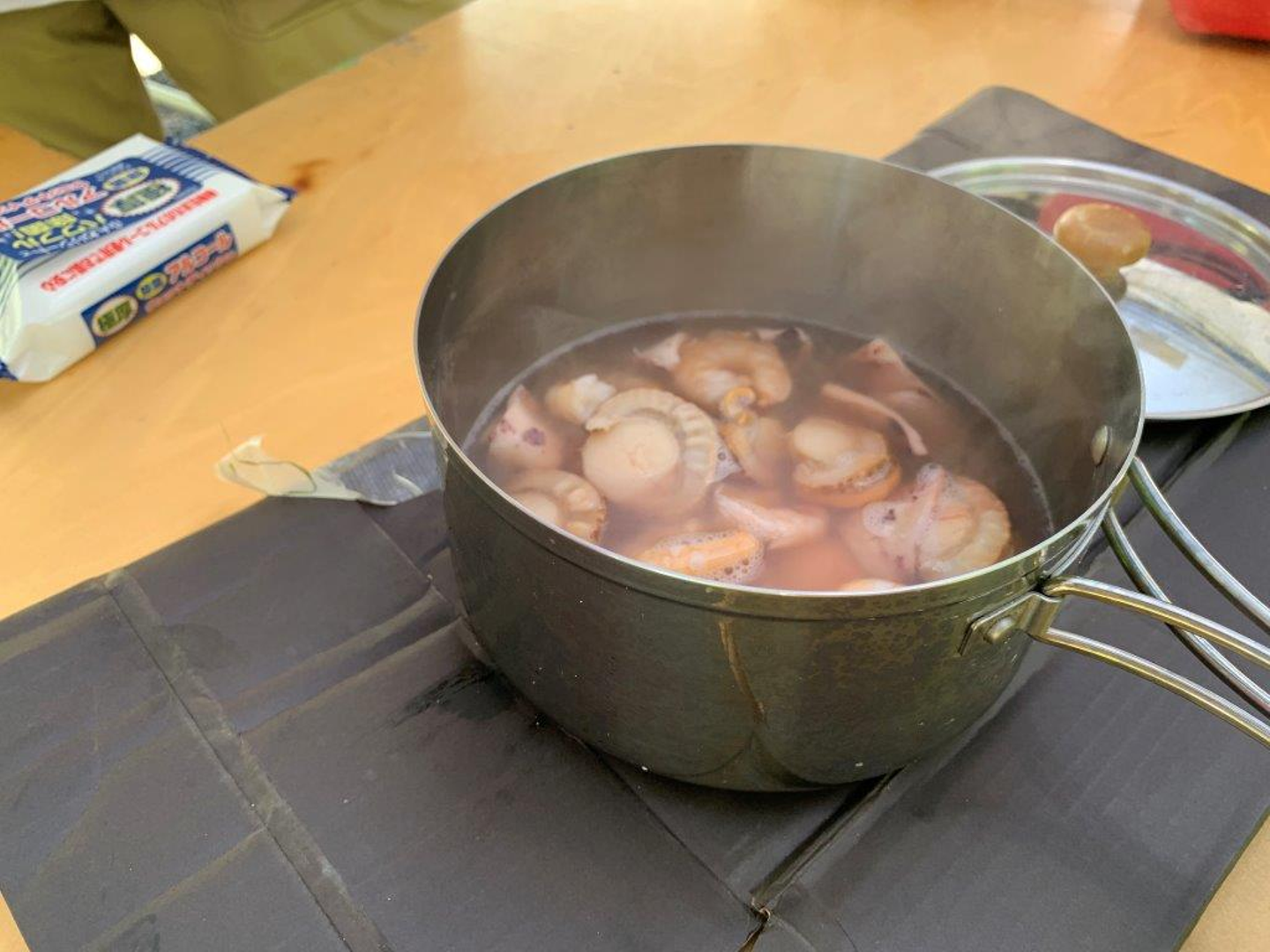 こちらは、焼き用に買ってきた魚介を煮込み料理にして提供中。