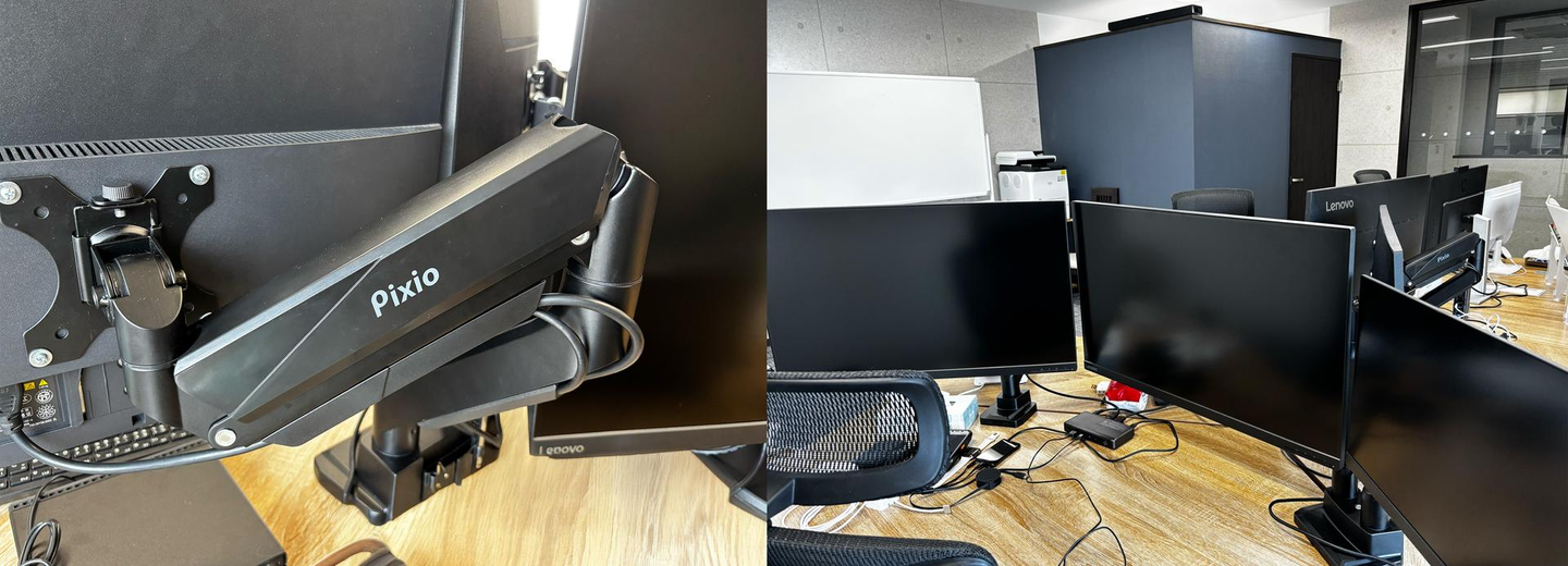 スリーケシステムの設備がパワーアップ!エンジニア業務には必須のモニターが多数導入。モニターだらけのオフィスです笑。モニターアームも設置してMacBook Airと同時に数台のモニターを操れる環境に。