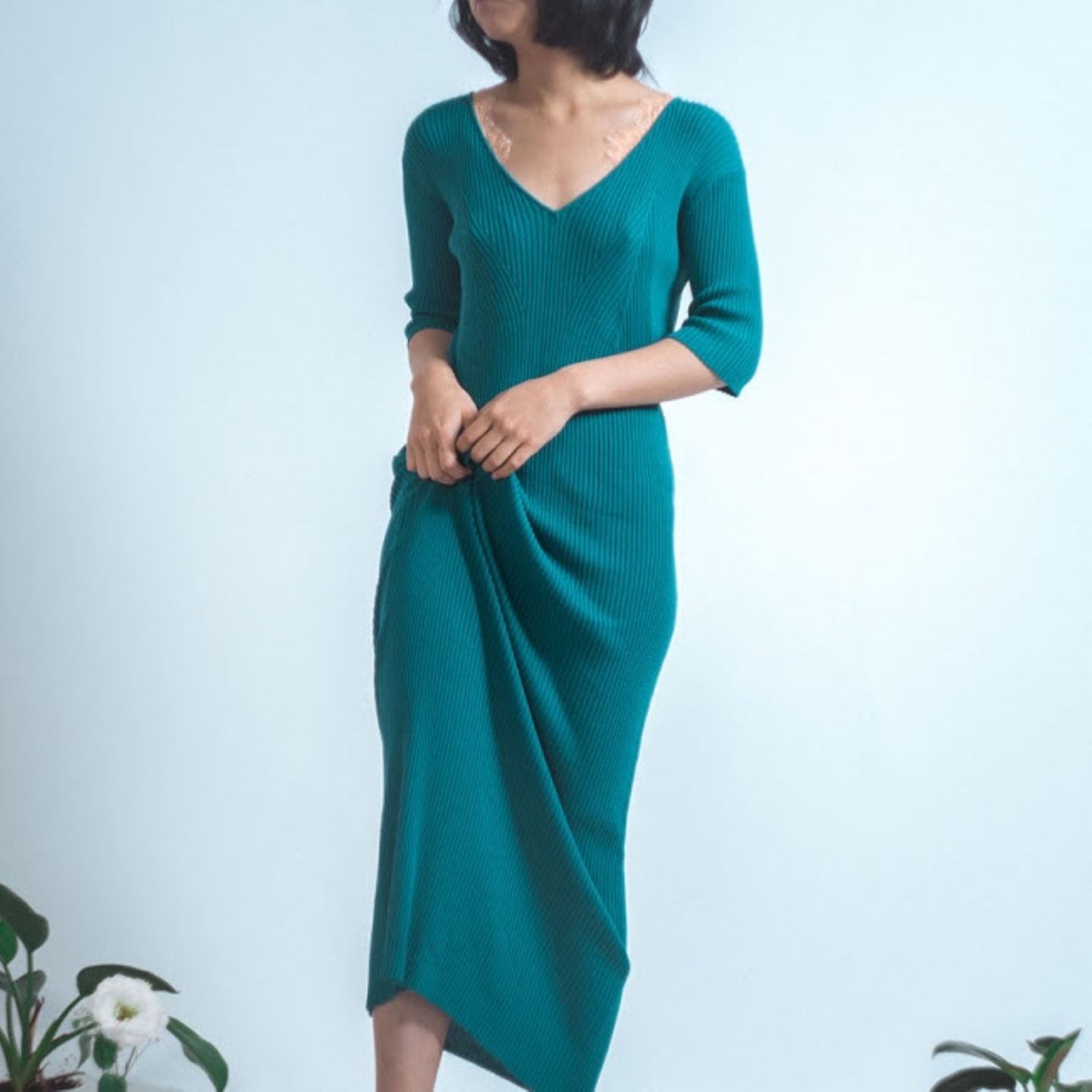 綿モダールの混合素材を贅沢に使用したワンピースは柔らかな着心地と落ち感の美しい洗練されたシルエットが魅力。 角度にこだわったVネックはデコルテラインを綺麗にみせてくれます。