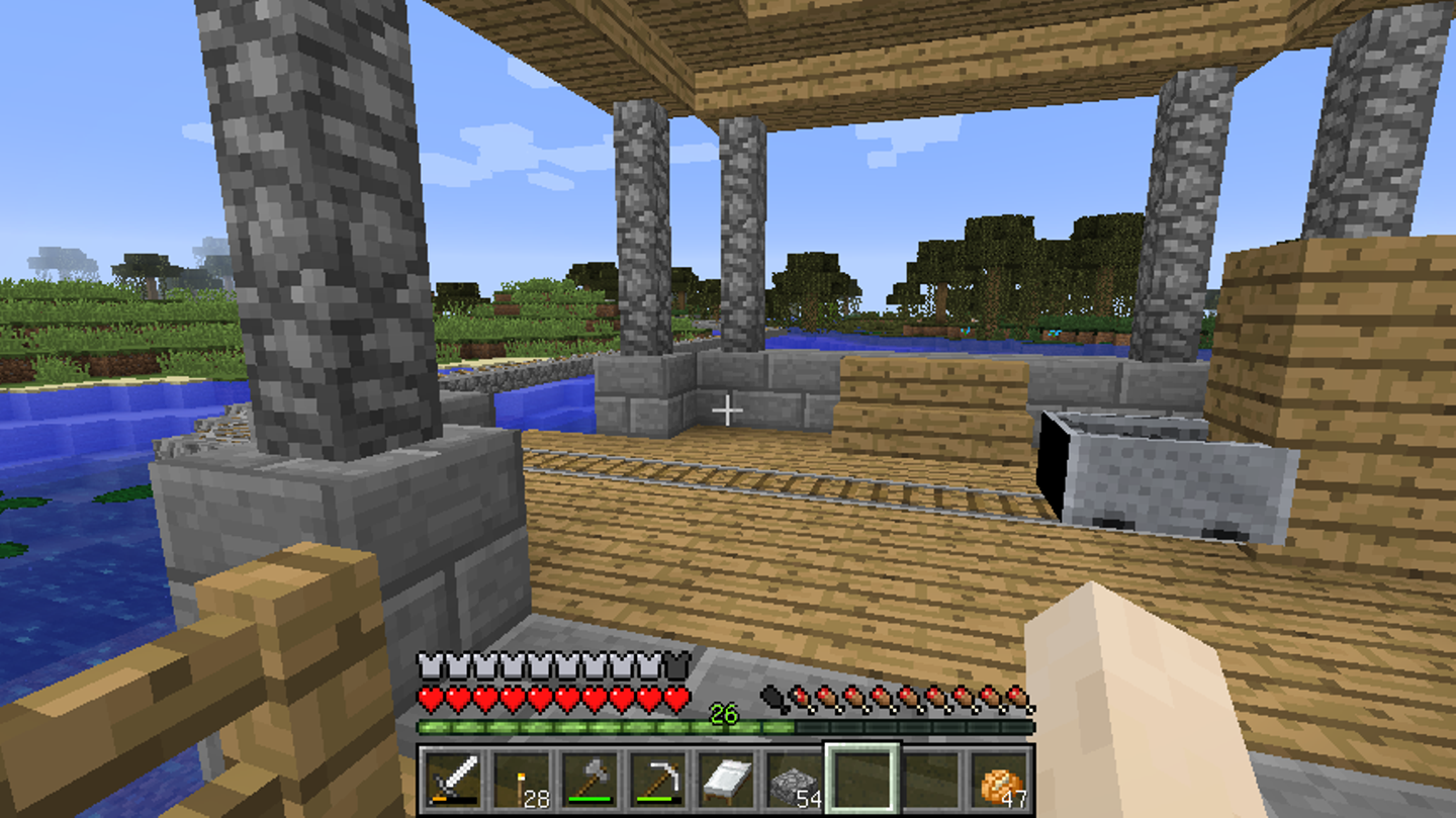 現在は鉄道建設で大忙し。マイクラをやったことがないわたしでも、電車に乗って移動する様子をみているとわくわくしてきます🚃