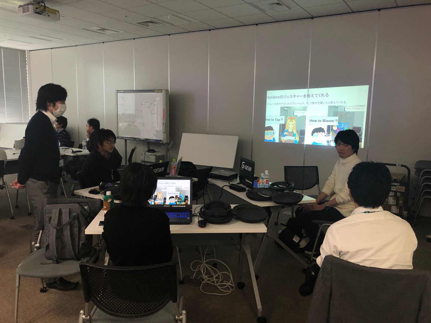 マイクロソフトが発売しているMR(MixedReality)デバイス「HoloLens」を利用し、MRエージェントと対話を行うアプリを作成しました。このコースでは弊社が一人一台開発用PCとHoloLensを用意し、Unityによるアプリケーションの実装を行ってもらいました。30万円近くする個人ではなかなか手が出せないデバイスを実際に用いることができたり、マイクロソフトMVPアワードを受賞されたメンターを含むスペシャリスト達からのフォローもあったりで刺激的だったようです。