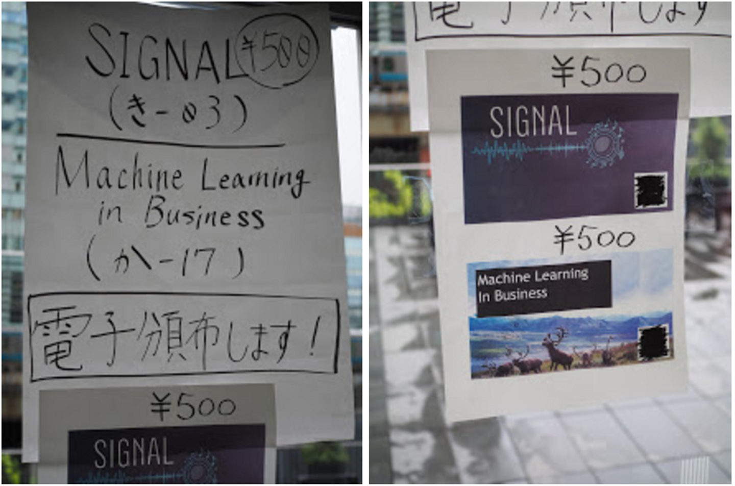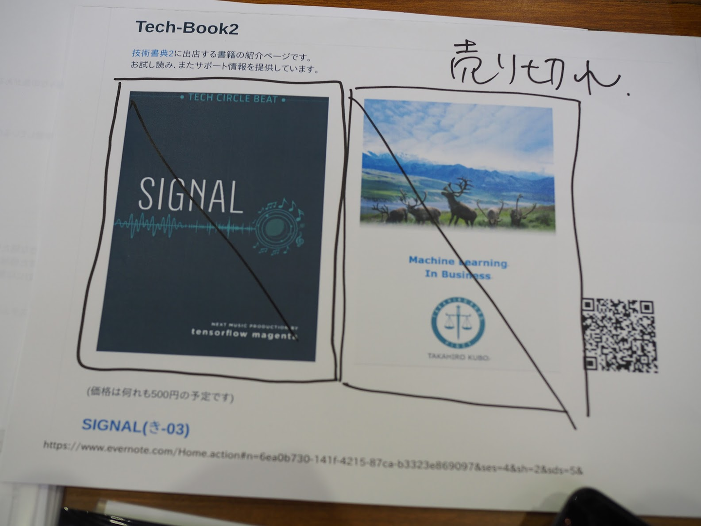 出展したブースは以下2つになります。表題の通り、Google Magentaを用いた機械学習による音楽生成についての本「SIGNAL」と、機械学習を実際にビジネスに適用する際に、そのプロジェクトの計画・検証・実際の開発までのポイントを網羅した「Machine Learning in Business」になります。