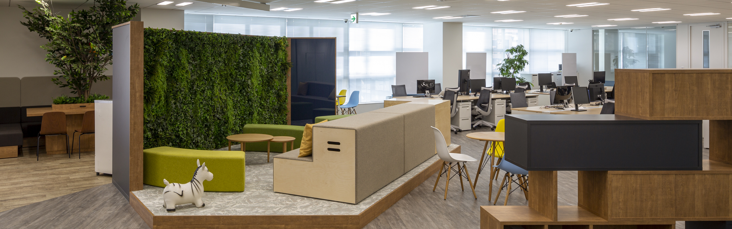 大きな窓のあるオフィス内は、明るくてとても開放的。靴を脱いでくつろげるリラックススペースや、緑のあるカフェスペースもあります。ミーティングをしたり勉強会をしたり、ちょっと一息ついたりもできる過ごしやすいオフィスです。