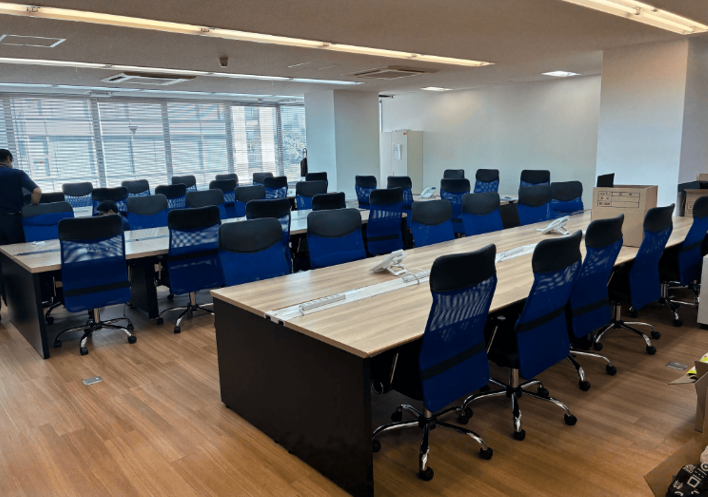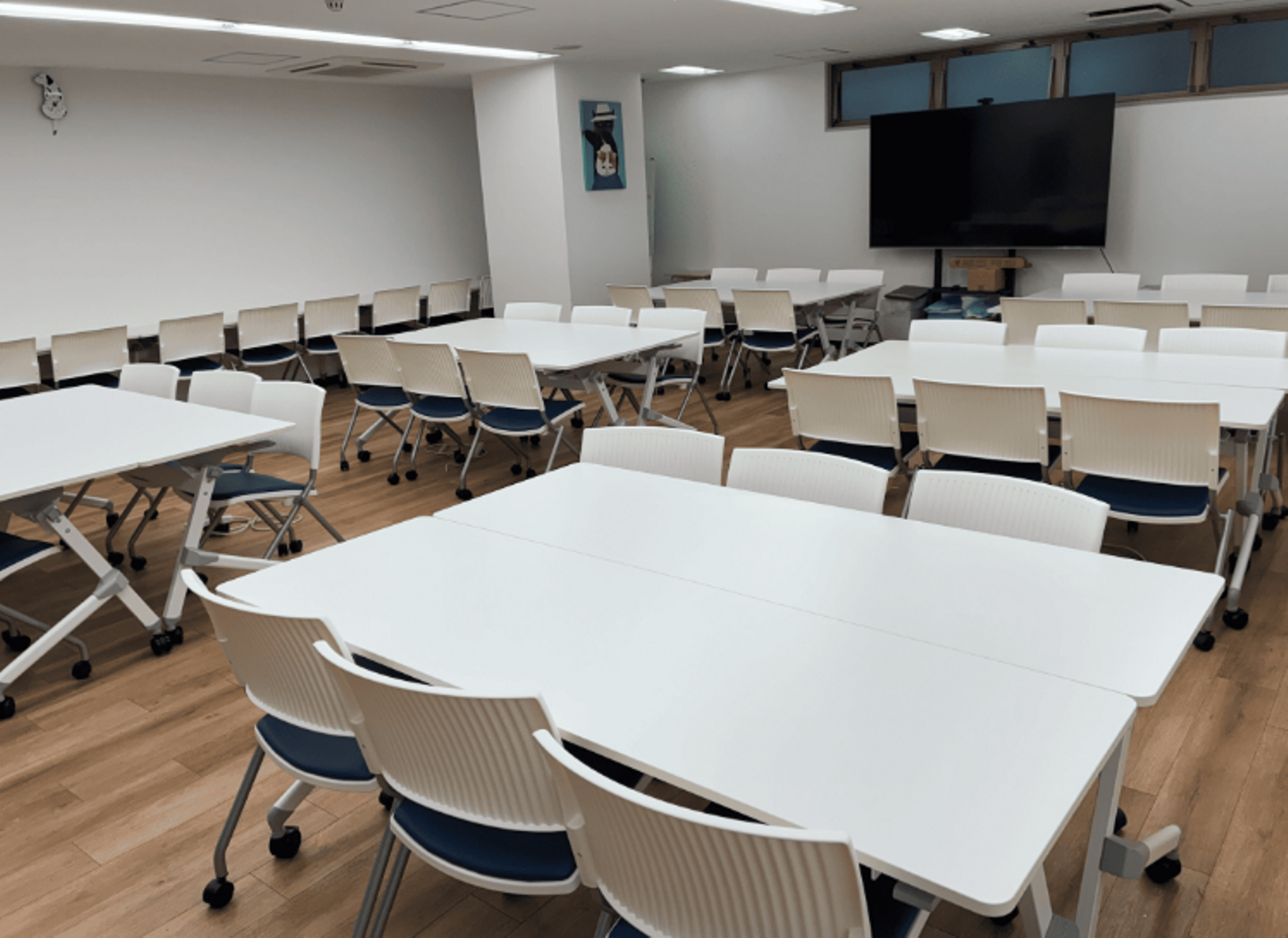 ここは研修会場や朝礼で使えるように、長椅子や椅子が設置されています。月に一度の加盟店向けの「tocotocoカレッジ」や全社員向けの研修などをこちらで行っています!毎週月曜日の朝礼でもここを使用しています!