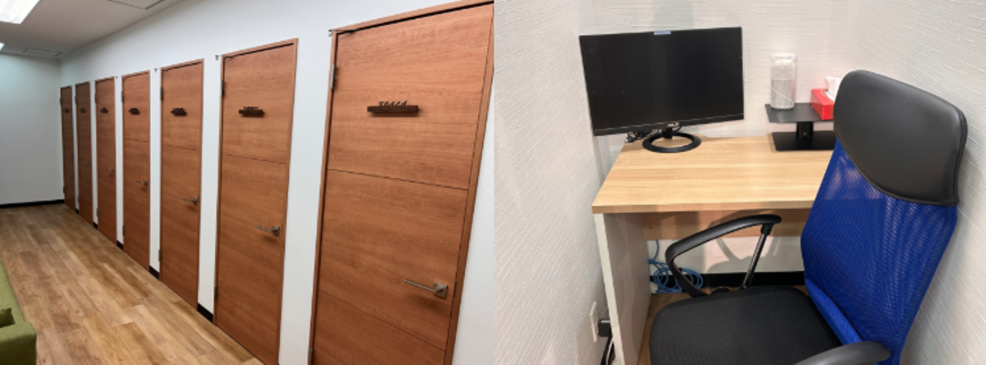 集中してオンラインや打ち合わができるように個室ブースも10部屋用意しています!