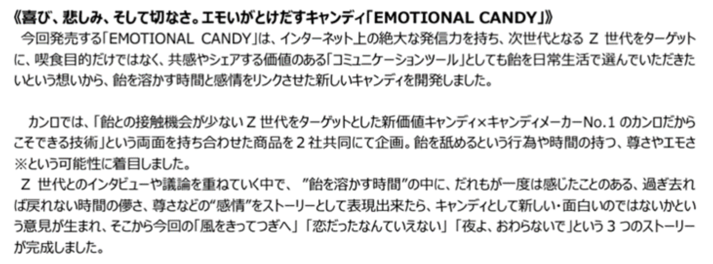 最後の事例は、カンロ飴でお馴染みのカンロ株式会社がPLAZAとコラボした「EMOTIONAL CANDY」です。