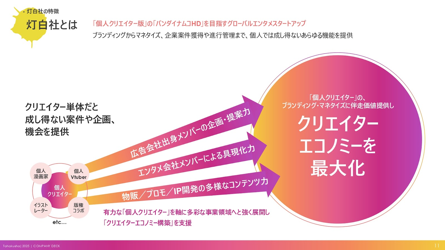 この度、クリエイターとの連携を軸とした独自のプロモーション・物販企画を展開する灯白社への出資をいたしました。近年、SNSや配信プラットフォームの急成長により、個人クリエイター発のキャラクターなど多くのIPが誕生しております。