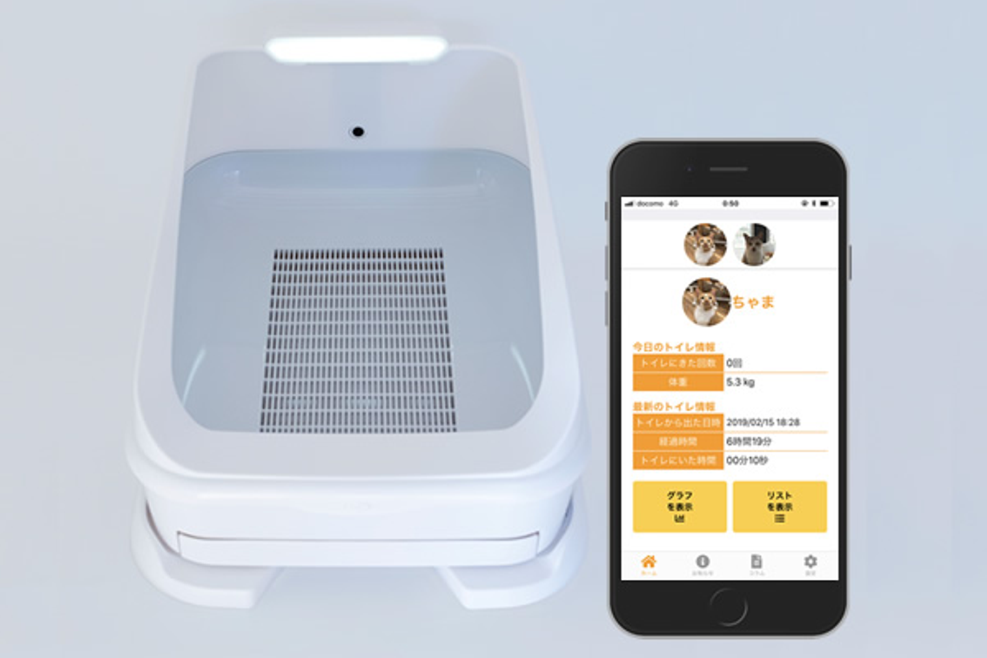 ねこがトイレに入るだけで様々な情報を自動で測定しアプリに表示いたします。