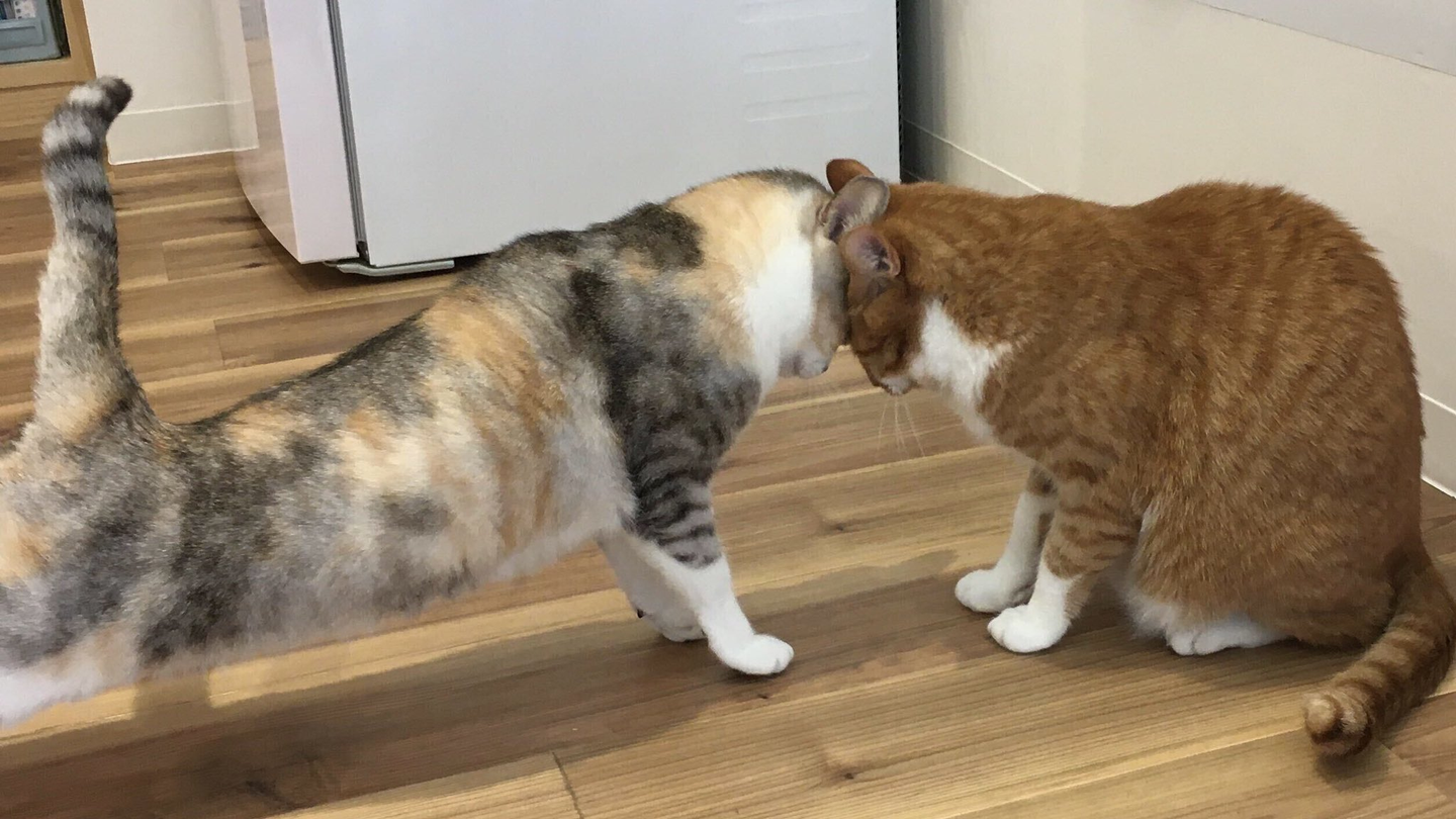 2人は保護ねこで、野良ねこ時代からずっと一緒にいるほど大の仲良し、オフィスにいると、