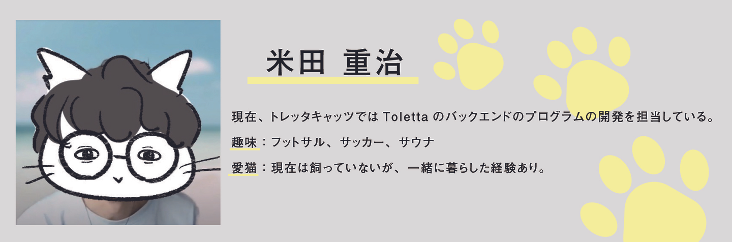 今回は、Tolettaのバックエンドのプログラム開発を担当している「 米田重治 」さんにインタビューしていきます!