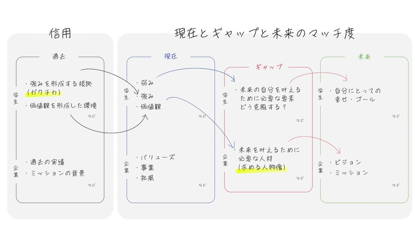 この4つの要素が見えると、自分がどこの企業に行きたいのかが明確になりますし、企業からの納得感も得ることができます。