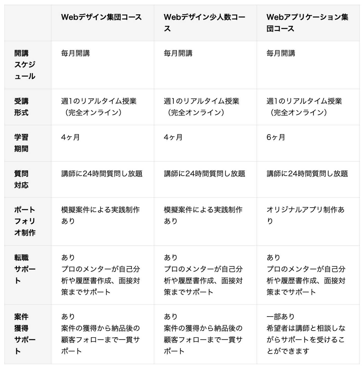 単なるデザインスキルを学習するだけでなく、営業→要件定義→Webデザイン→コーディング→保守運用といったように、Web制作案件を受注してから納品したあとのプロセスまでを一気通貫して学習できるカリキュラムとなっています。