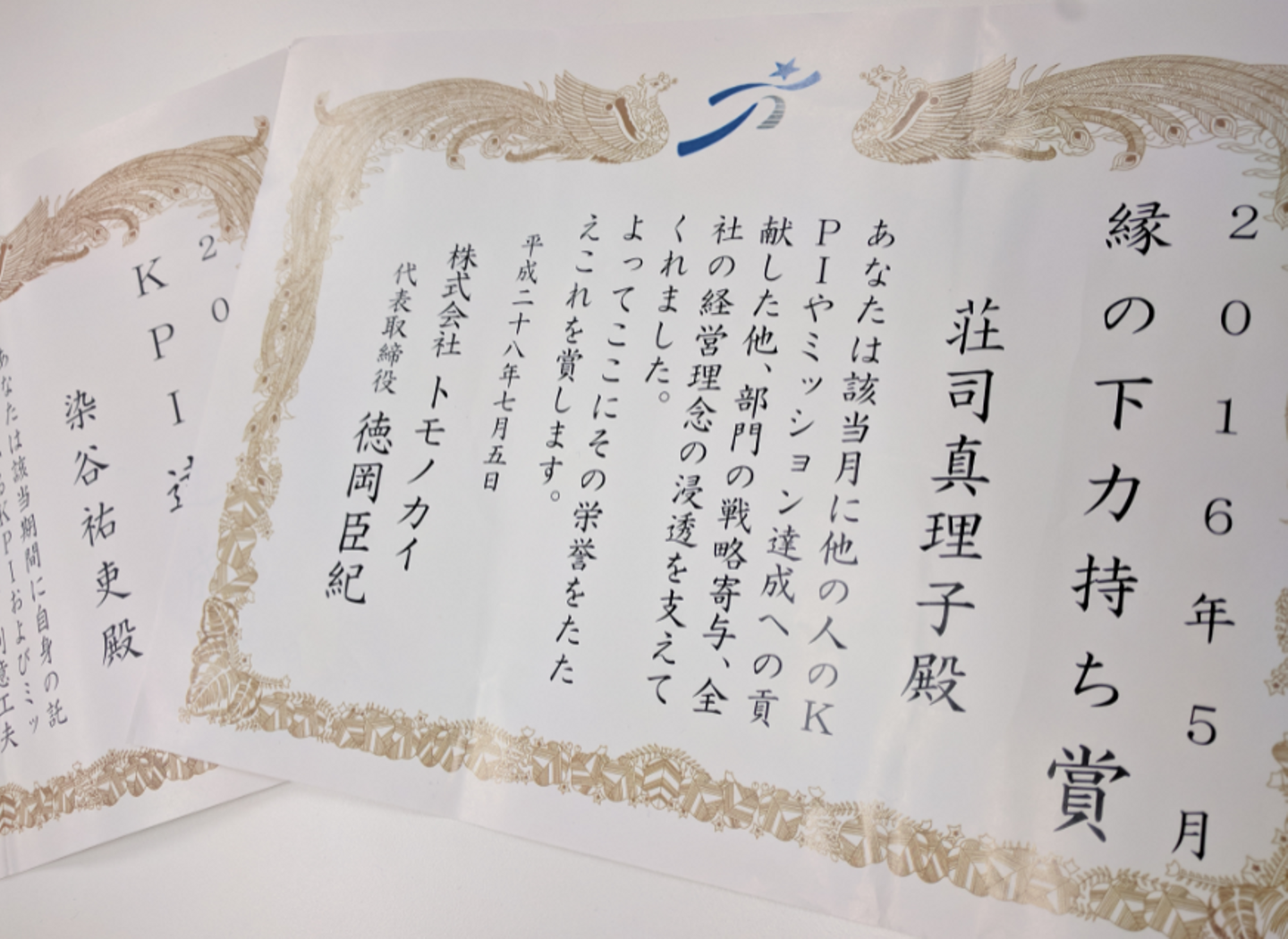 ・毎月全社員の中からKPI達成賞と、縁の下の力持ち賞が選出され表彰される