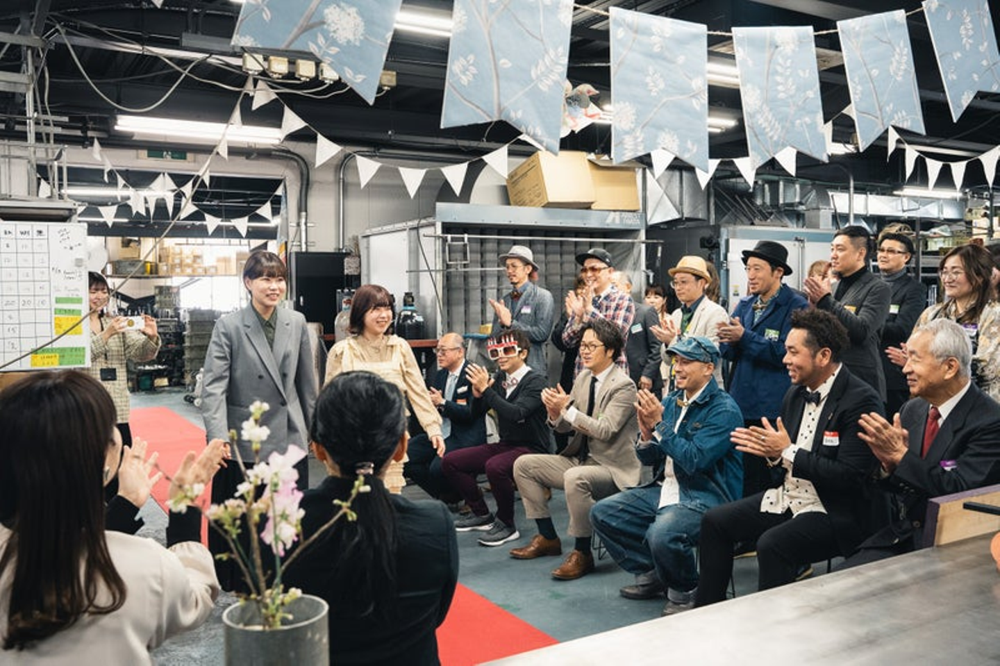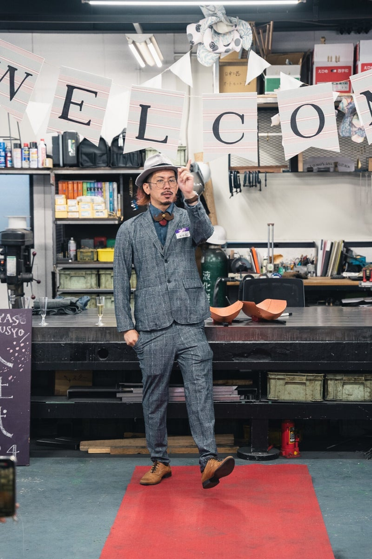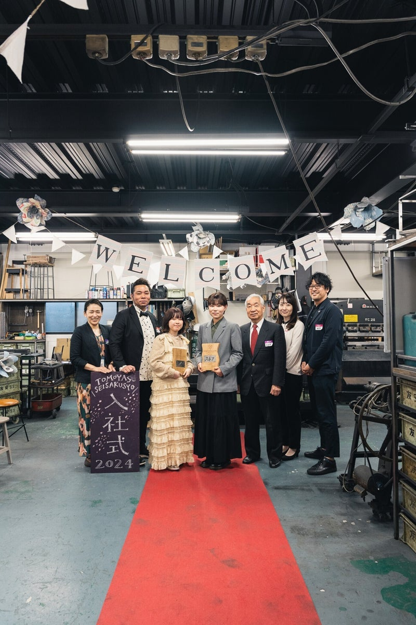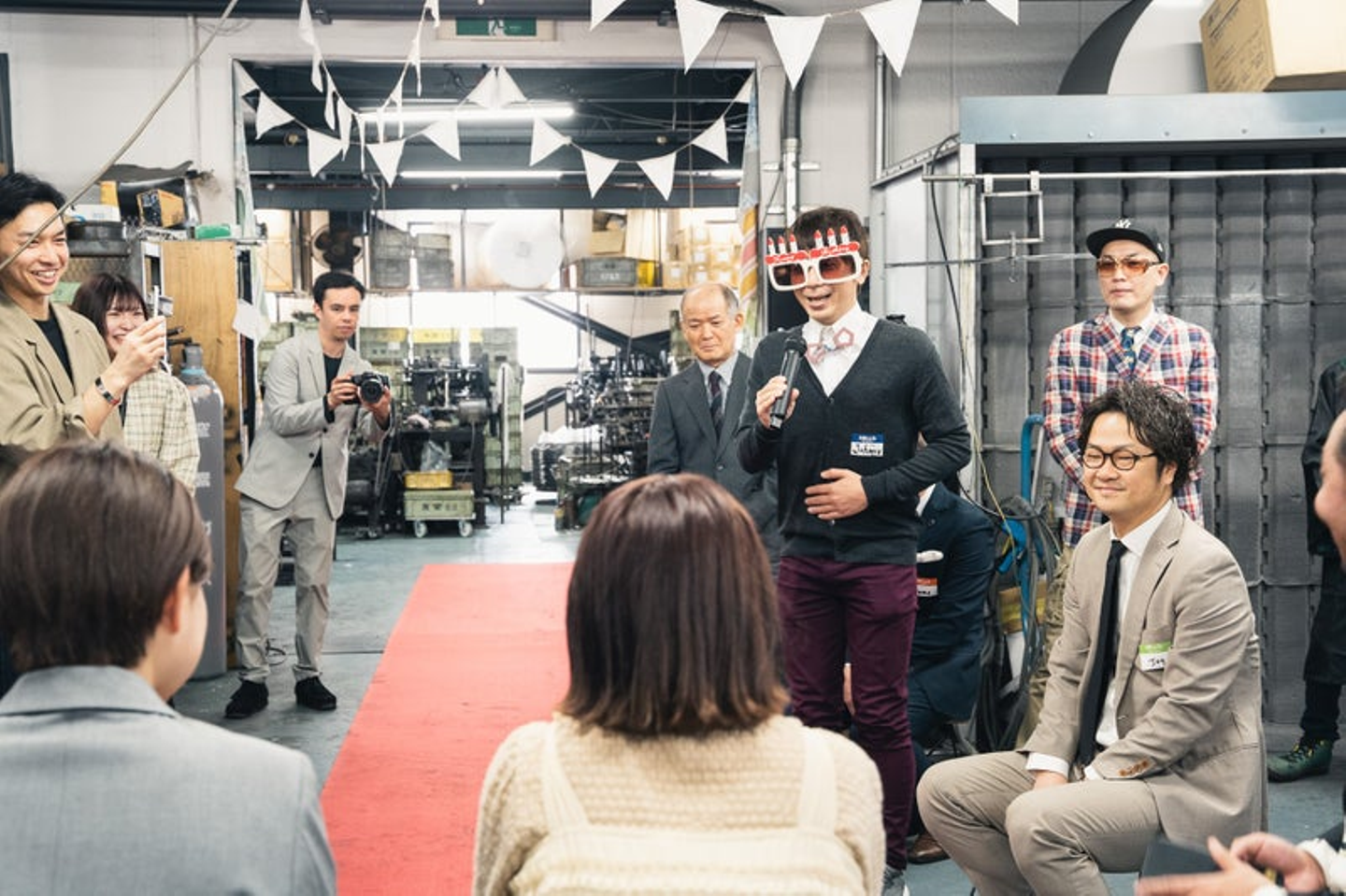 会場は、会議室やホールではなく、本社工場の中にある鉄工所。友安製作所の原点とも言える場所です。普段は鉄の加工を行っている場所ですが、めいいっぱい飾りつけをして、レッドカーペットを敷くと、華やかな会場に変身しました。