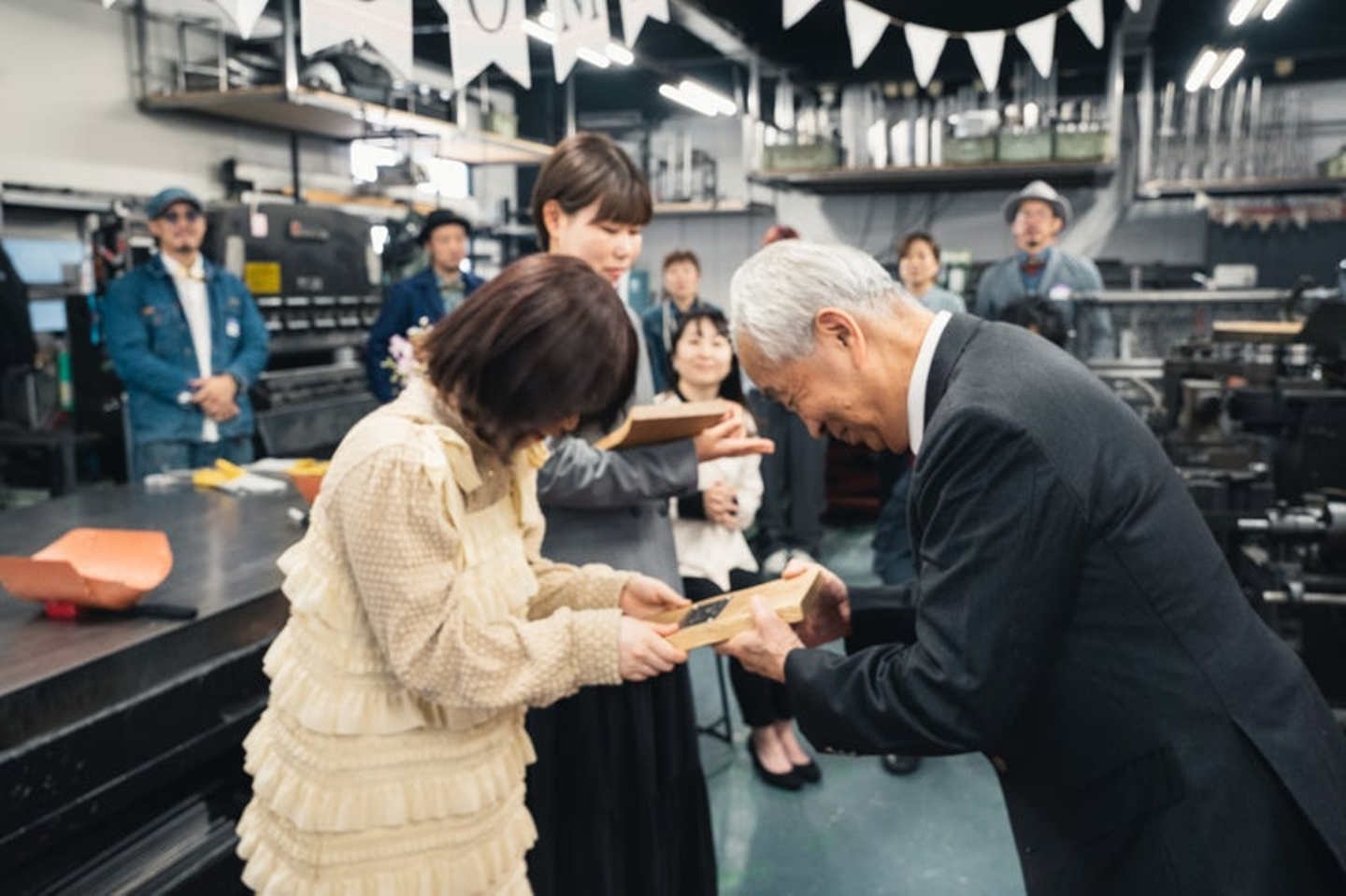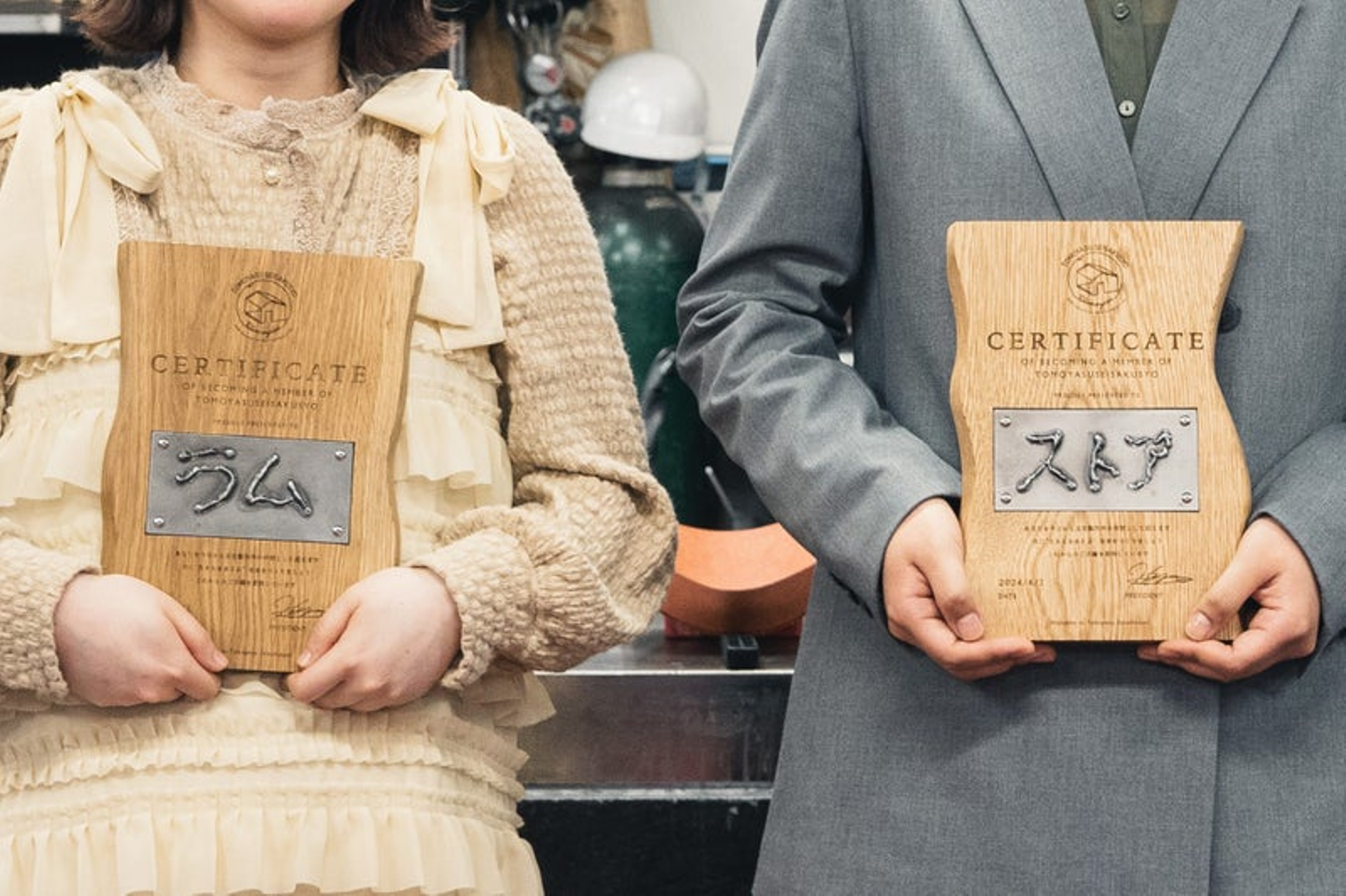 最後に会長であるDonから、入社証を授与。この入社証は、木工職人が一枚ずつ削り出した木の板に、レーザー刻印を施した友安製作所オリジナルの盾。そこに、入社式で2人が溶接したプレートをはめて完成したものです。