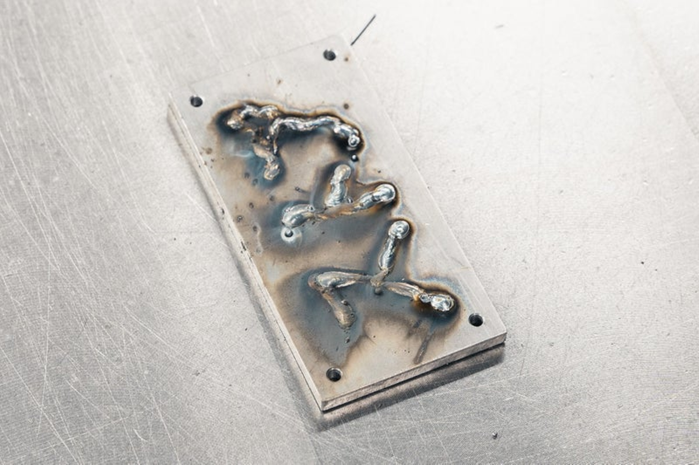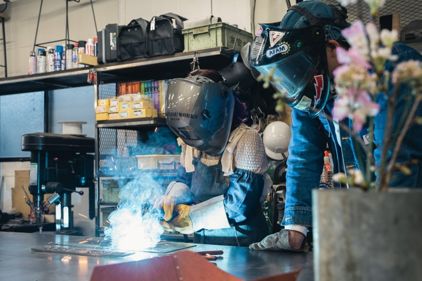 そしてお待ちかねの溶接に挑戦。今回は、溶接の技術を使って、鉄のプレートにそれぞれのビジネスネームを書いてもらいました。先輩の溶接職人Punchが先生です。