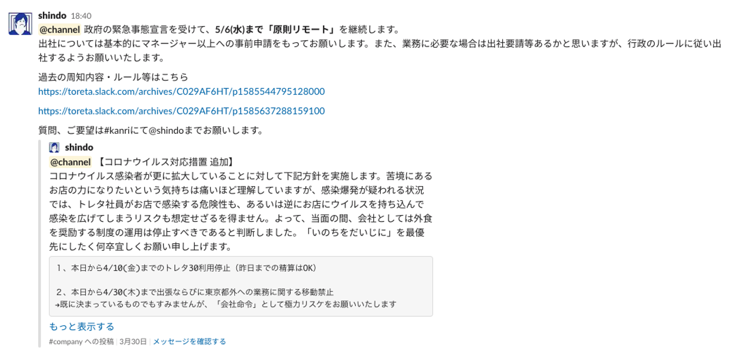 元々、全社員への周知が必要な情報発信はSlackチャンネル「#company」で行うというルールがありました。けれど、新型コロナウイルスへの関心が高まる中、社員が政府やメディア発信の情報や記事をシェアすることも増えてきて。未曾有の事態に全員が不安を抱え、どの情報をどう捉えたらいいかもわからない状態で情報が錯綜している状態や、全社員に向けた重要な情報が流れやすくなっている点に課題を感じました。そこで、新型コロナウィルスに関する外部の情報シェア、悩みや不安を気軽に相談できる場として 「#新型コロナウィルス関連情報」という新しい特設チャンネルを作りました。例えば、産業医の先生から教えていただいた予防方法などの情報もそこで共有しています。そして、「全員が目を通さないといけない情報」は引き続き「#company」 に投稿することで情報発信の場を明確に区別しました。それにより、社員が重要な情報をキャッチアップしやすくなったのではと思います。
