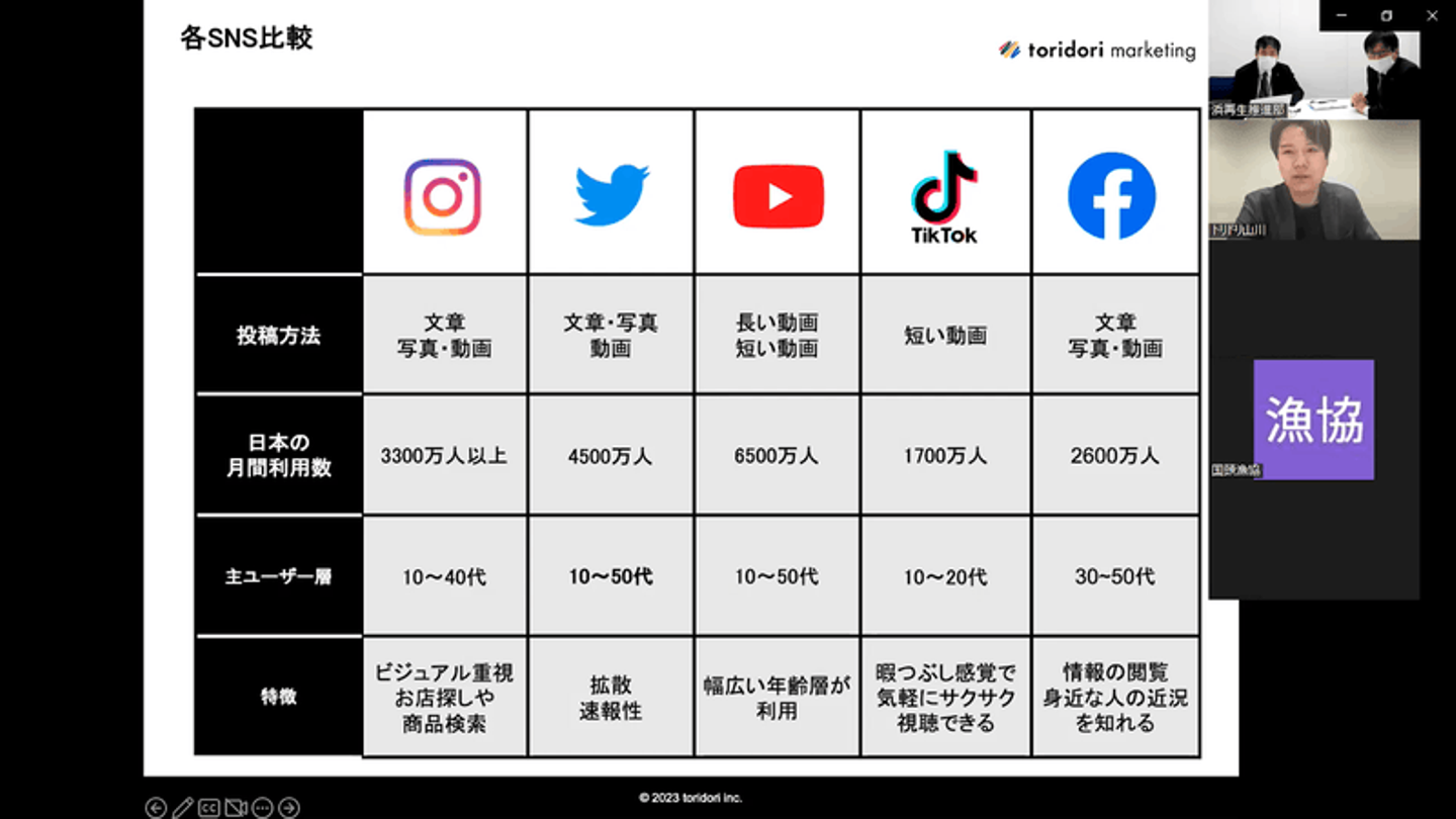 先日、全国漁業協同組合連合会(JF全漁連)様と協業という形で、全国の漁協関係者に向けて実施した「SNSを基礎から学べるオンラインセミナー」を実施いたしました。