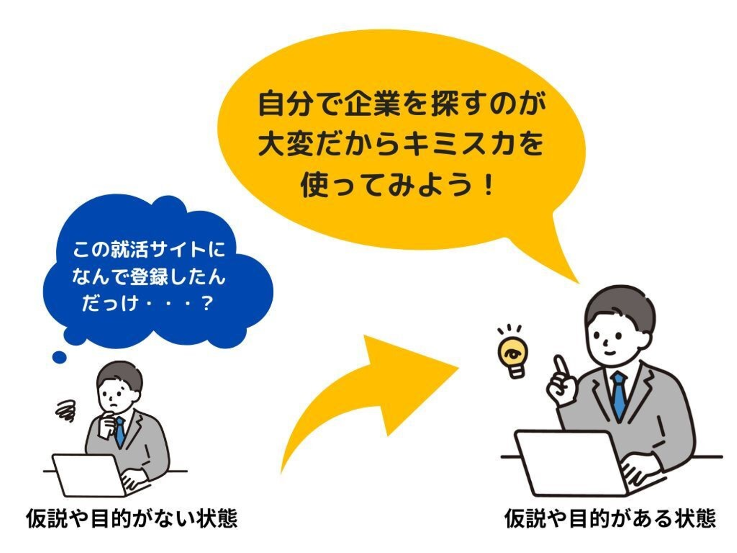 そして、これが重要なのですが、「仮説をもって何事も取り組むべし」ということです。複数の就活サイトに登録して頭を悩ませている人は、そもそも「なんで自分はこの就活サイトを使うんだっけ?」というところに立ち戻って考えてみてください。