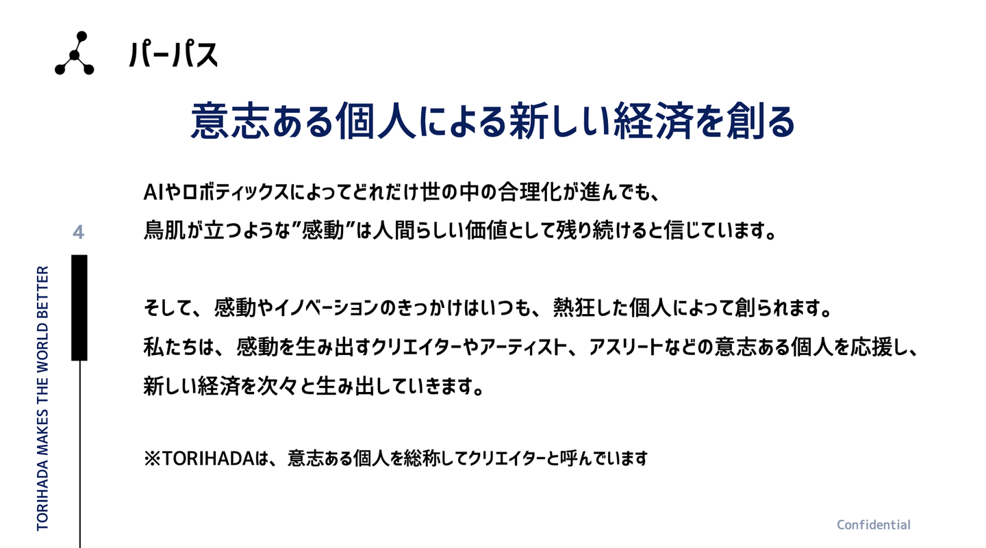 TORIHADAはパーパスとして「意思ある個人による新しい経済を創る」を掲げており、