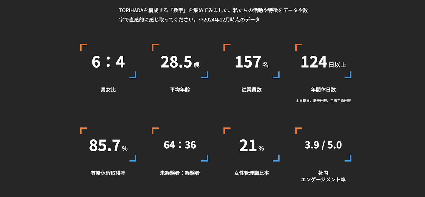 新卒採用と中途採用の割合など、具体的な数字で分かる情報を新たに追加し、これまで以上に分かりやすくアップデートしました。これにより、応募者の皆さまにTORIHADAの採用活動や職場環境について、よりリアルで具体的なイメージを持っていただける内容になっています。