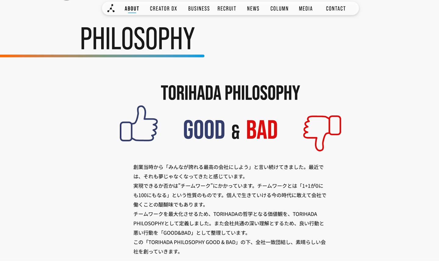 また、新しく公開した弊社のフィロソフィー「TORIHADA PHILOSOPHY GOOD & BAD」もぜひご覧ください。このフィロソフィーは、創業時から掲げている「みんなが誇れる最高の会社にしよう」という目標を実現するための指針として若井CEOによって策定されました。価値観を明確にし、チームワークを最大化するために、良い行動と悪い行動を具体的に定義しています。